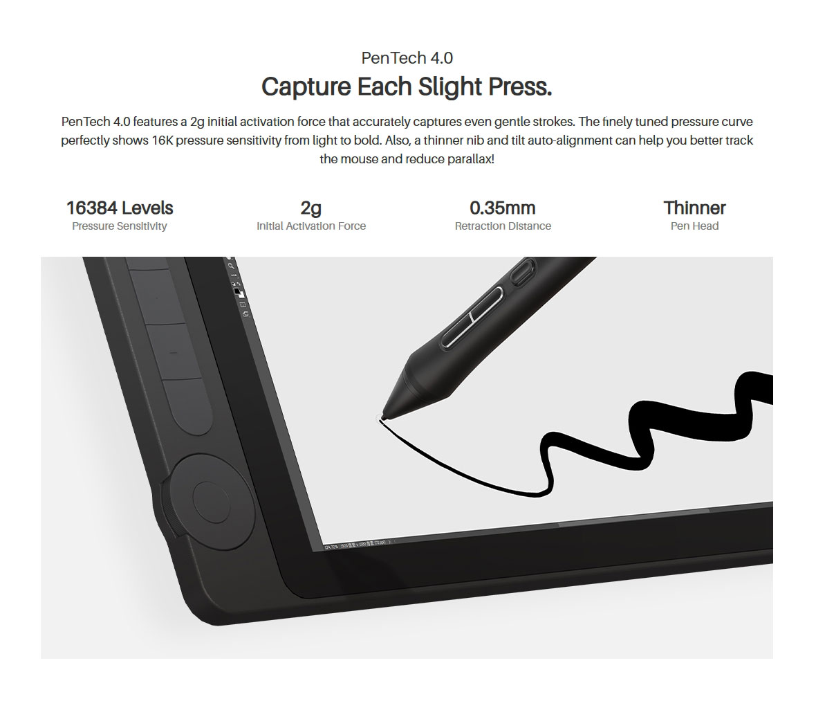- Pentech 4.0 -kynä, 16384 painetasoa, ±60° kallistuksen tunnistus