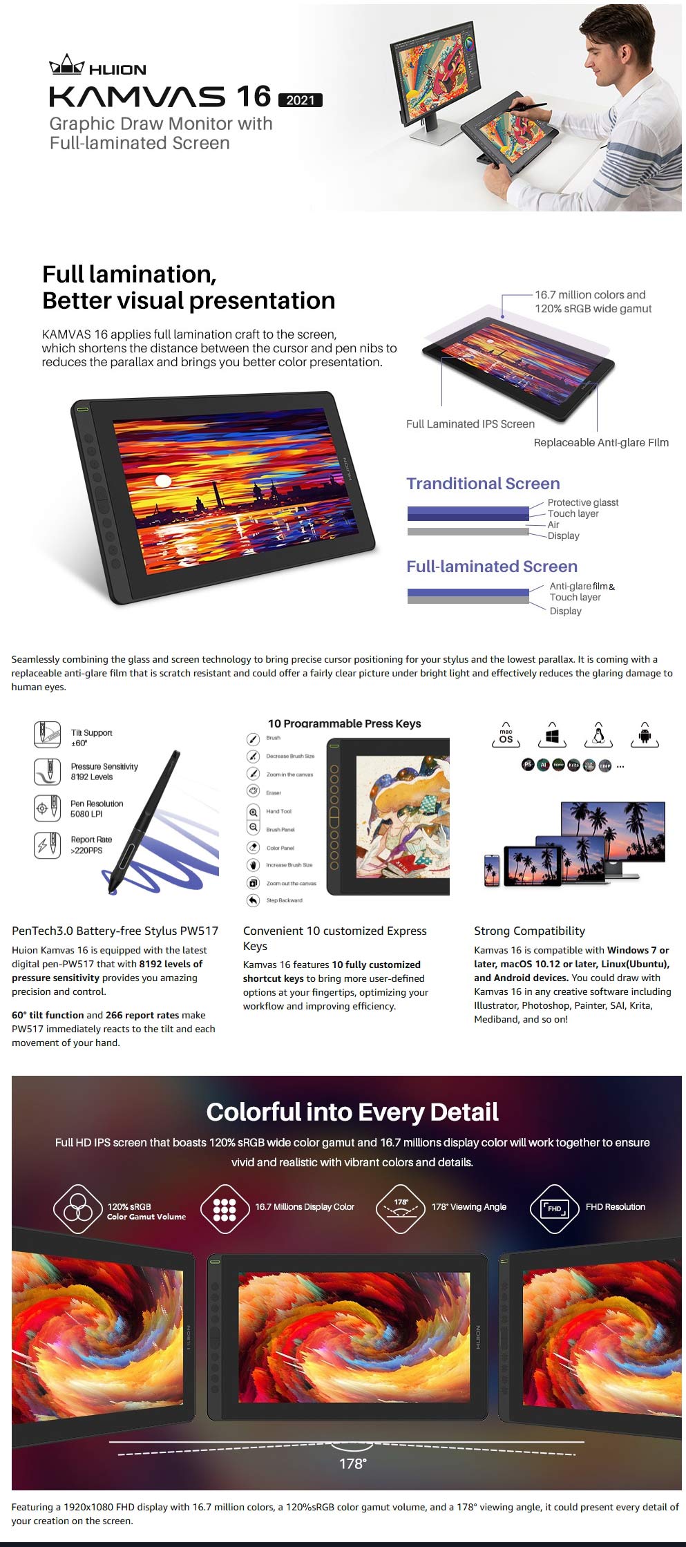 HUION KAMVAS 16 on 15.6-tuumainen piirtonäyttö, joka yhdistää täysin laminoidun näytön, laajan väriavaruuden ja tarkan, akkuvapaan kynän. Se sopii digitaalisille taiteilijoille, suunnittelijoille ja opiskelijoille, jotka arvostavat luonnollista piirrosjälkeä ja sujuvaa työnkulkua eri käyttöjärjestelmissä.
