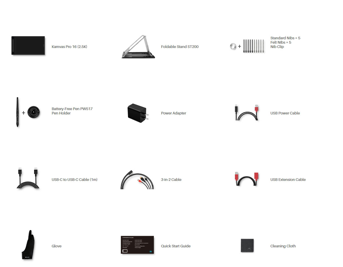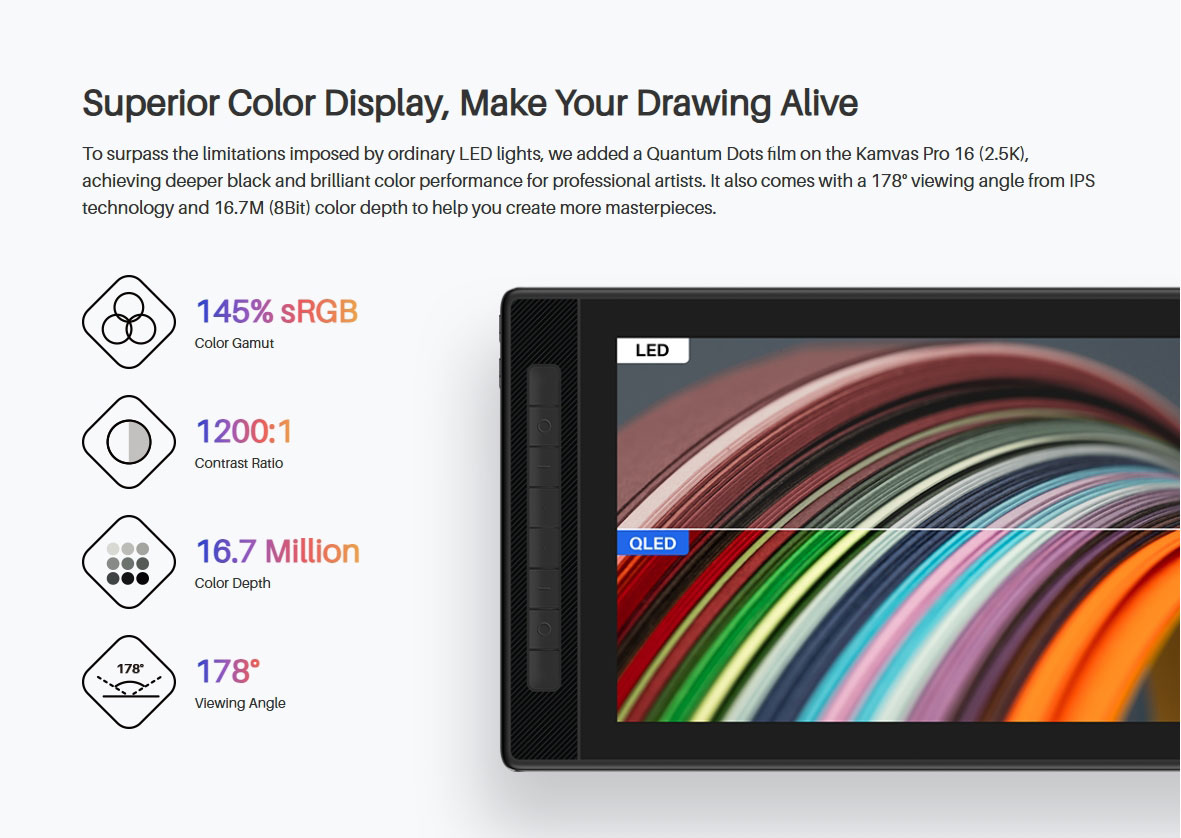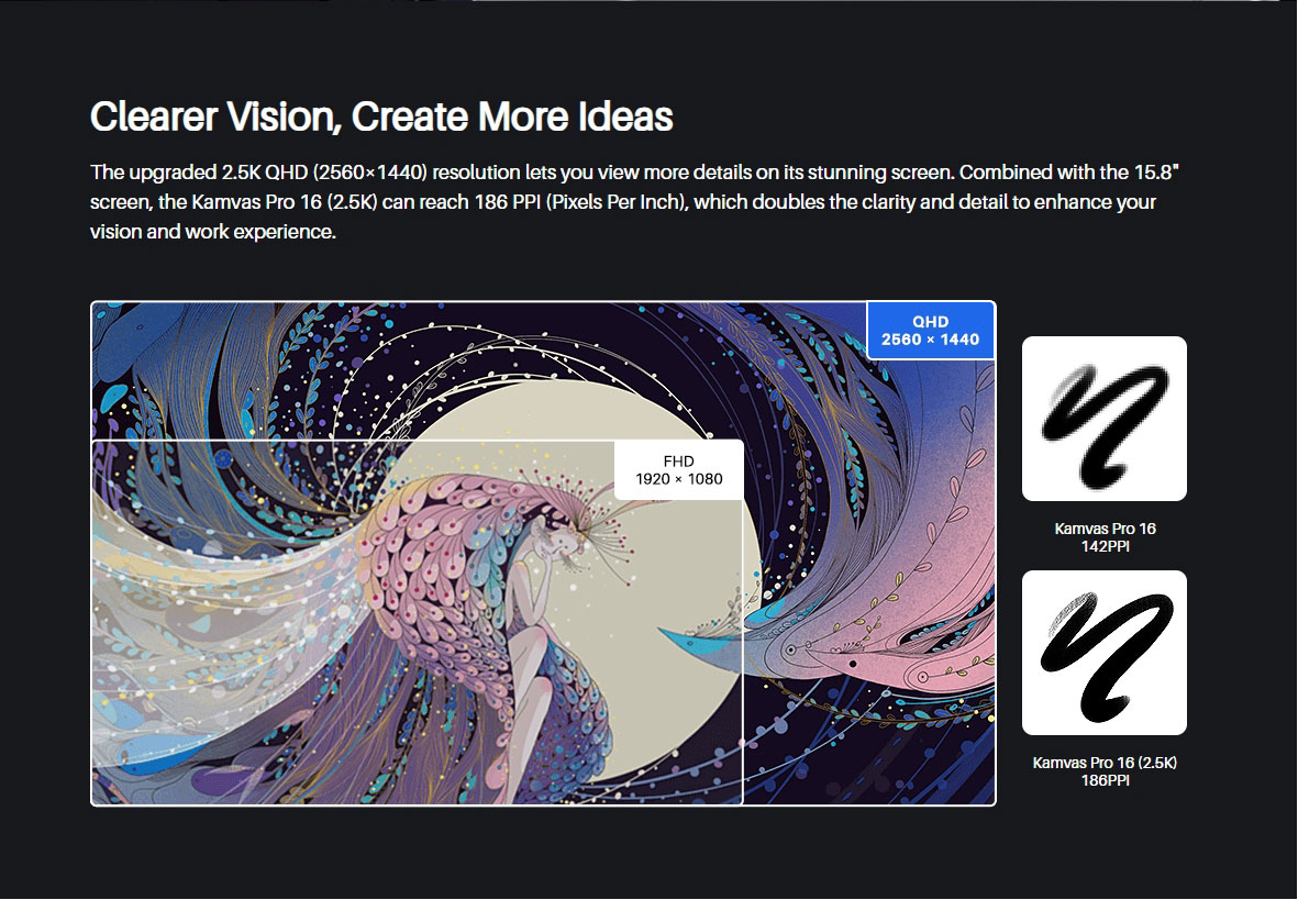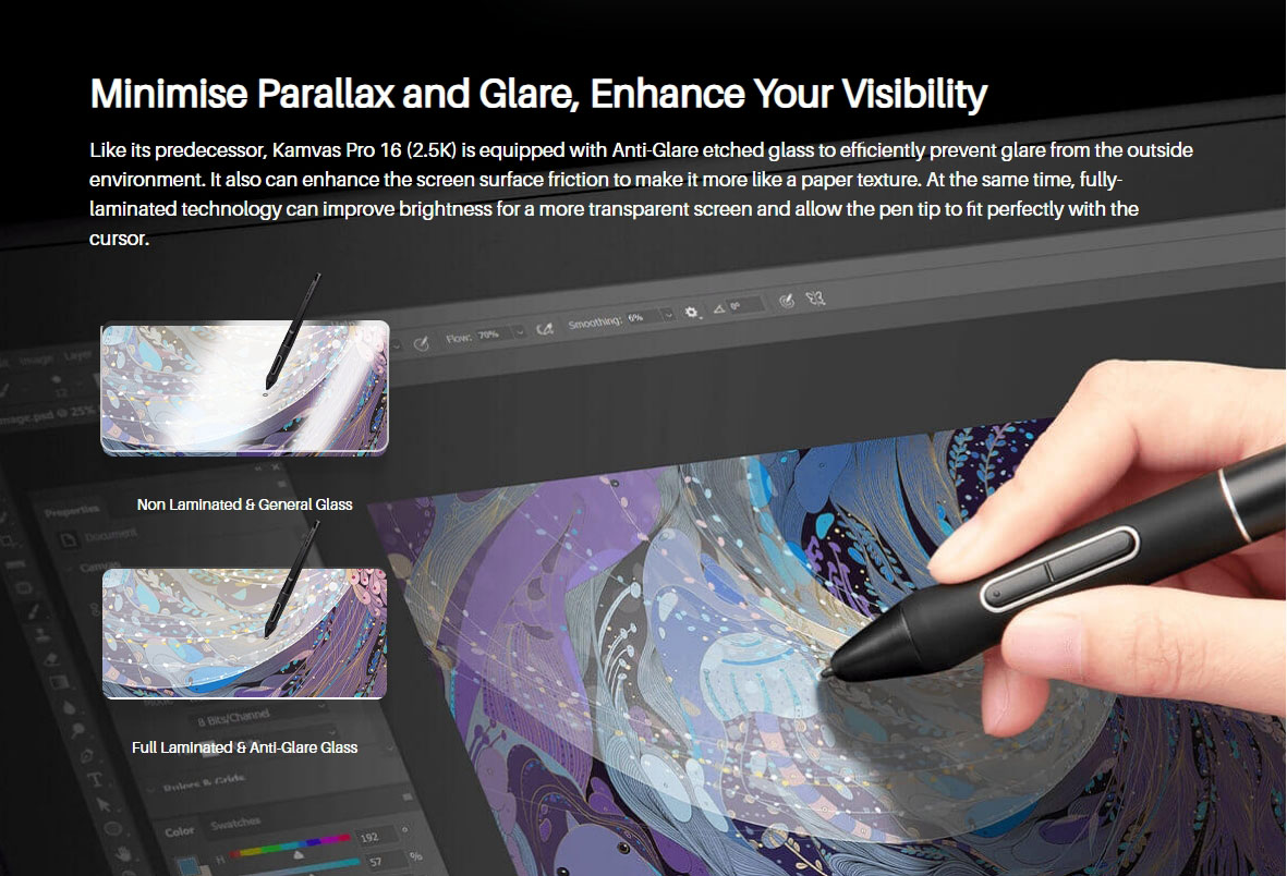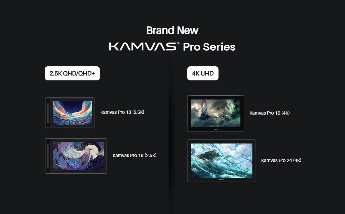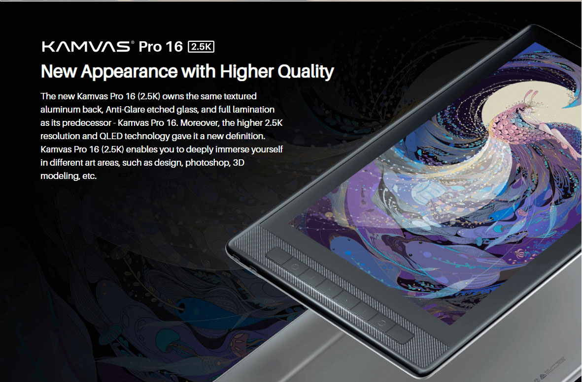 Kamvas Pro 16 (2.5K) on 15.8-tuumainen piirtonäyttö, jossa on QLED-tekniikka, 2.5K QHD -tarkkuus ja täyslaminoitu, heijastusta vähentävä kaiverrettu lasipinta. PW517-kynä tarjoaa 8192 paineentunnistustasoa ja ±60° kallistustunnistuksen. Mukana 8 ohjelmoitavaa pikanäppäintä ja USB‑C-liitännät.