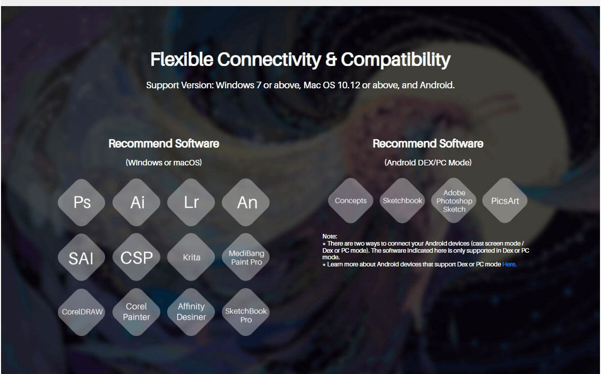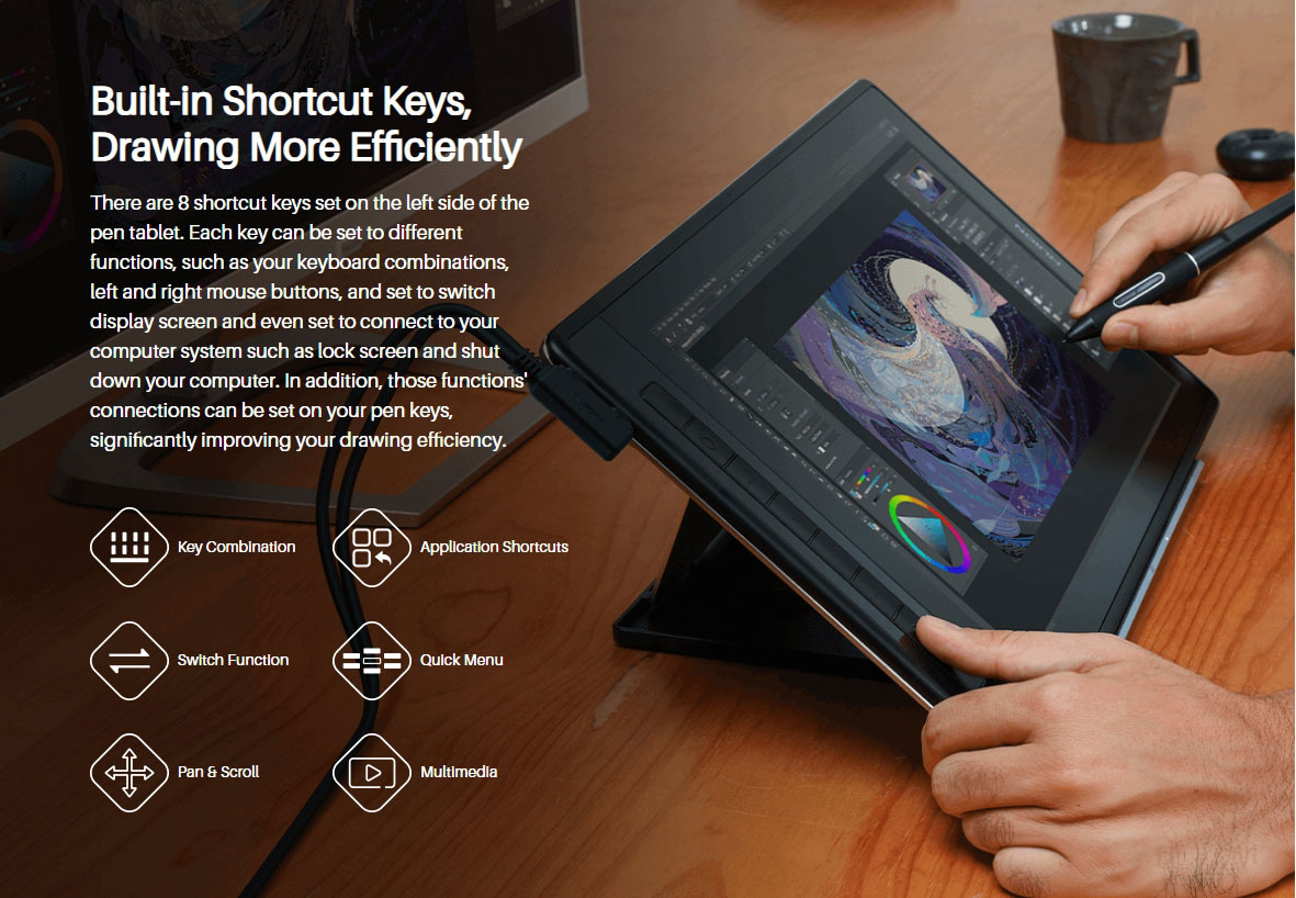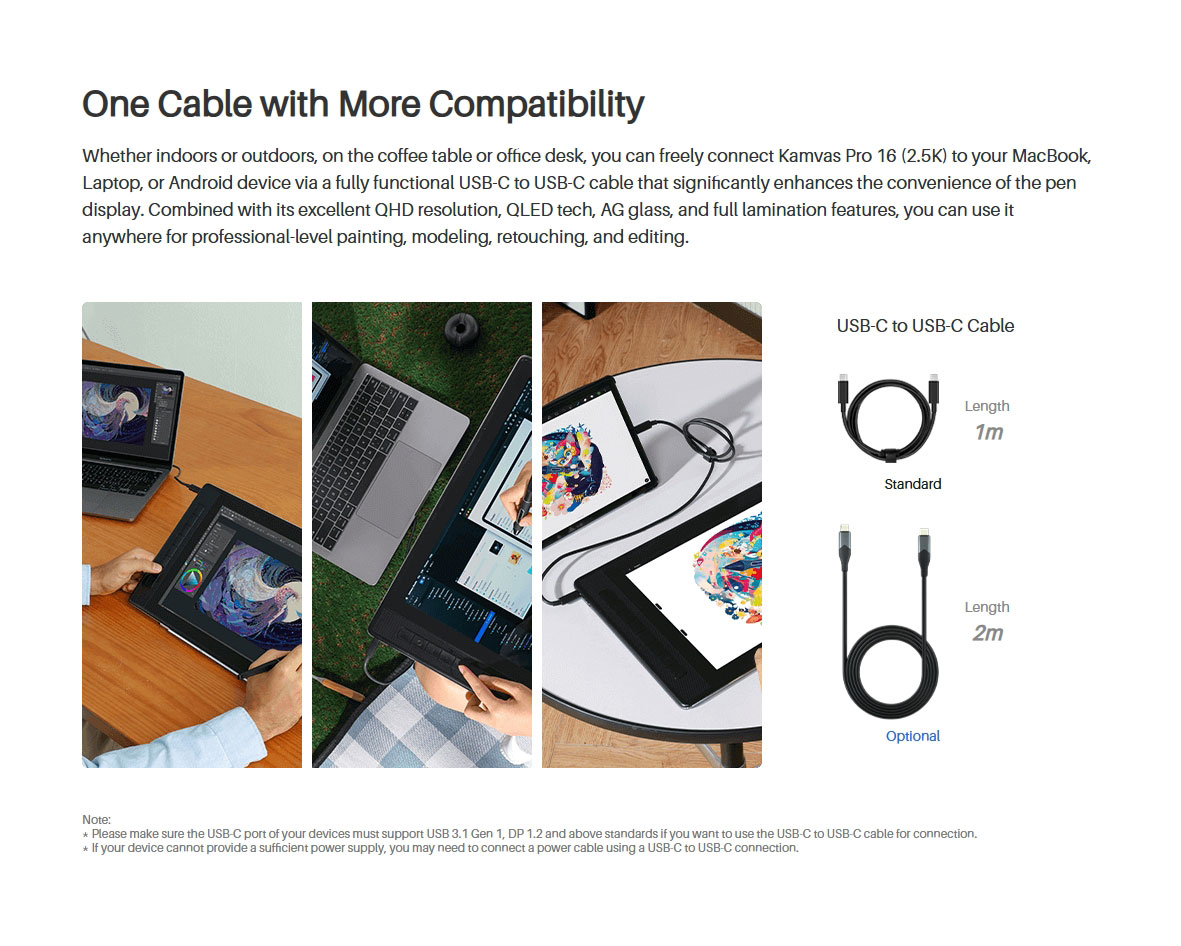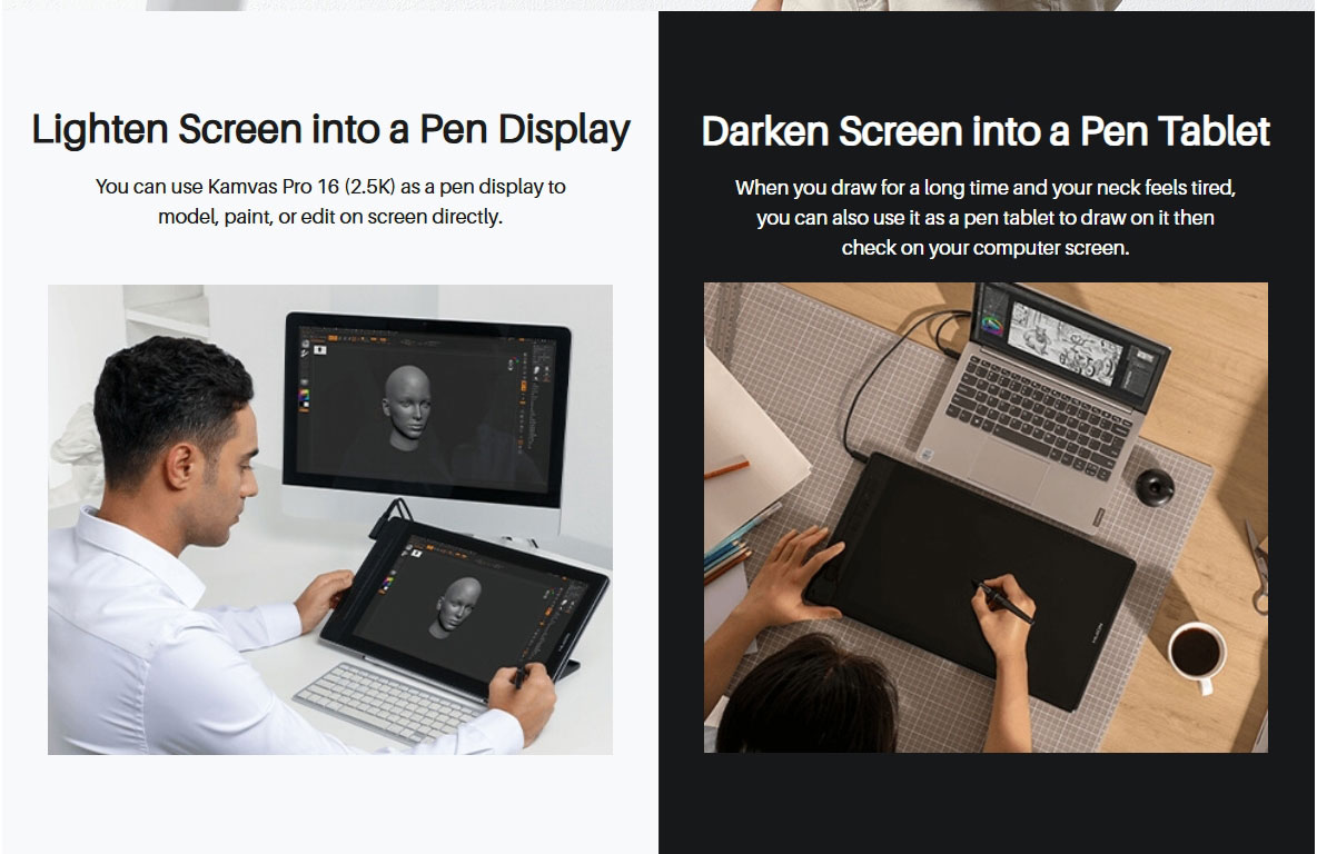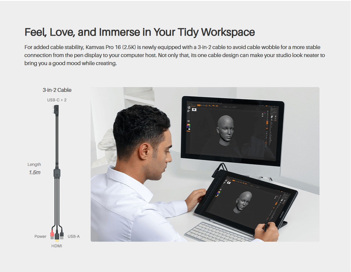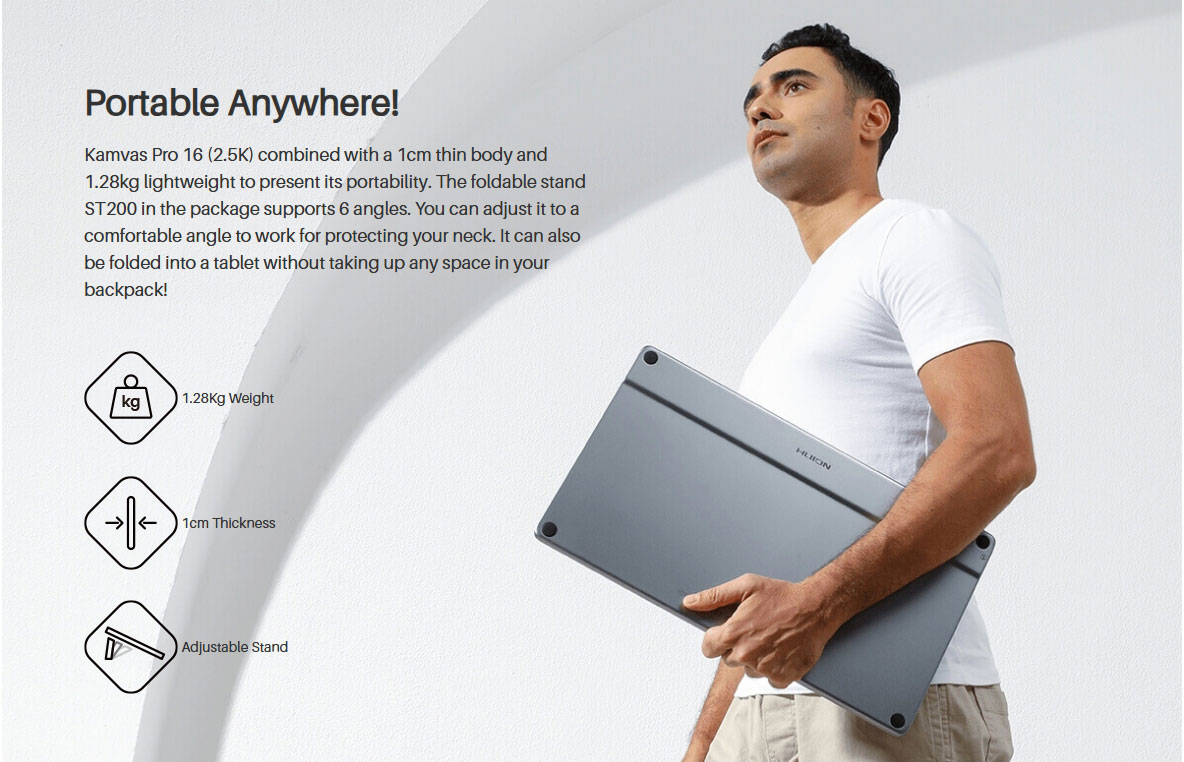Kamvas Pro 16 (2.5K) on 15.8-tuumainen piirtonäyttö, jossa on QLED-tekniikka, 2.5K QHD -tarkkuus ja täyslaminoitu, heijastusta vähentävä kaiverrettu lasipinta. PW517-kynä tarjoaa 8192 paineentunnistustasoa ja ±60° kallistustunnistuksen. Mukana 8 ohjelmoitavaa pikanäppäintä ja USB‑C-liitännät.