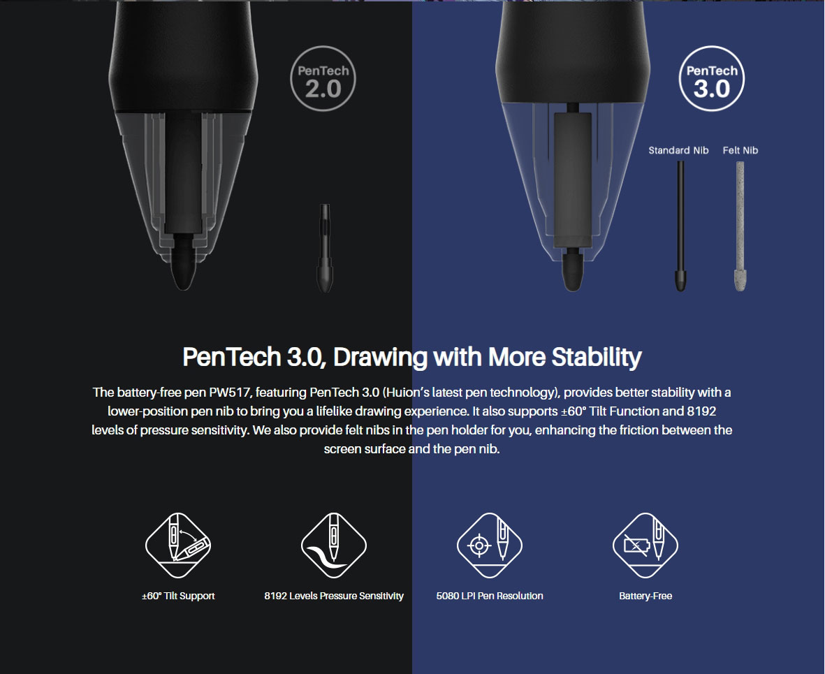 - PW517-kynä: 8192 tasoa, ±60° kallistus, 5080 LPI