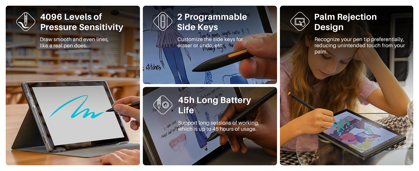 3. Piirtotabletti ladattavalla kynällä: Mukana tuleva ladattava kynä tukee 4096 tason painetunnistusta ja kallistusta, joten viivat ovat pehmeitä ja tarkkoja. Magneettinen kiinnitys auttaa pitämään kynän tallessa.