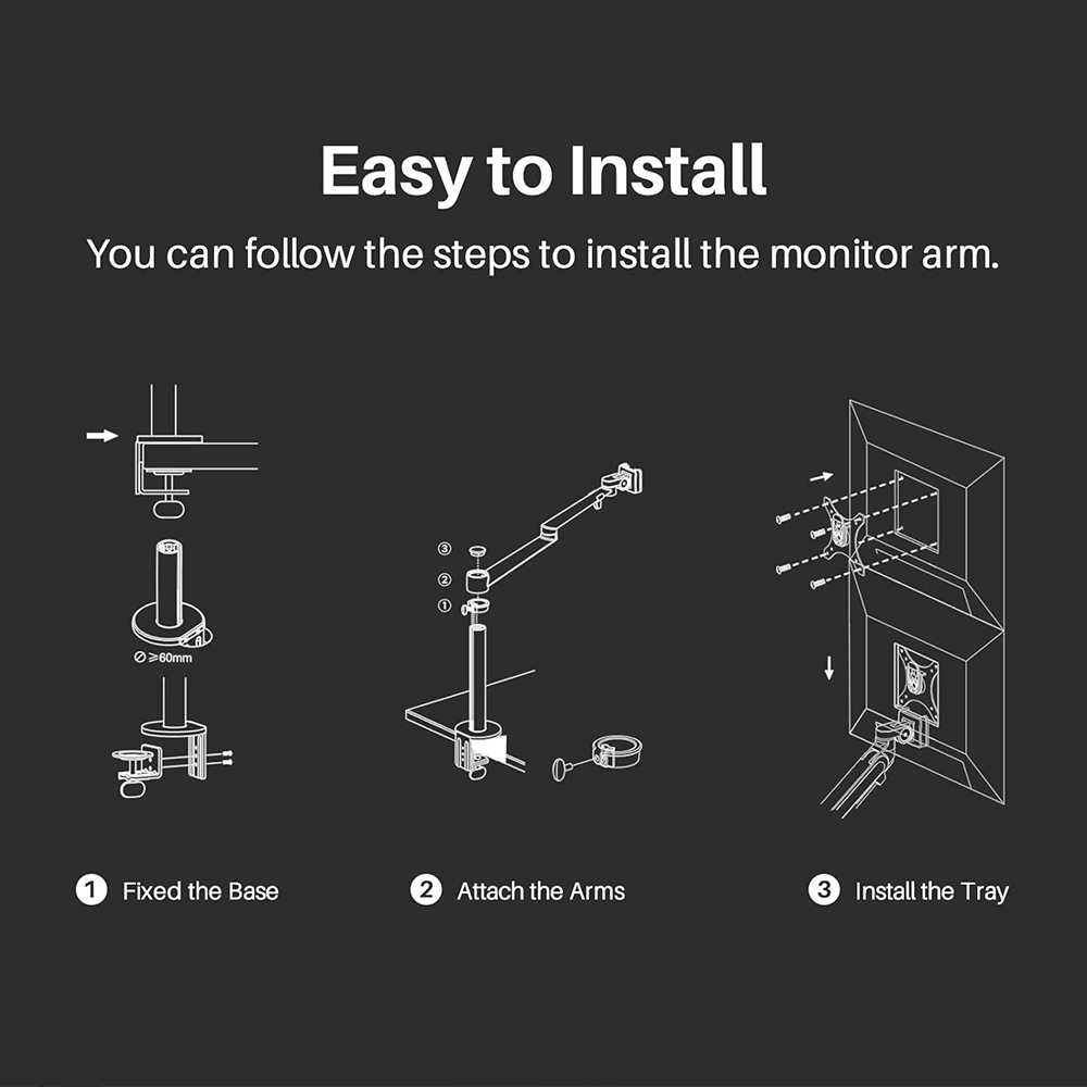 6. Nopea asennus: helppo kolmivaiheinen käyttöönotto — kiinnitä jalusta, asenna varsi ja lukitse näyttö VESA‑levyyn.