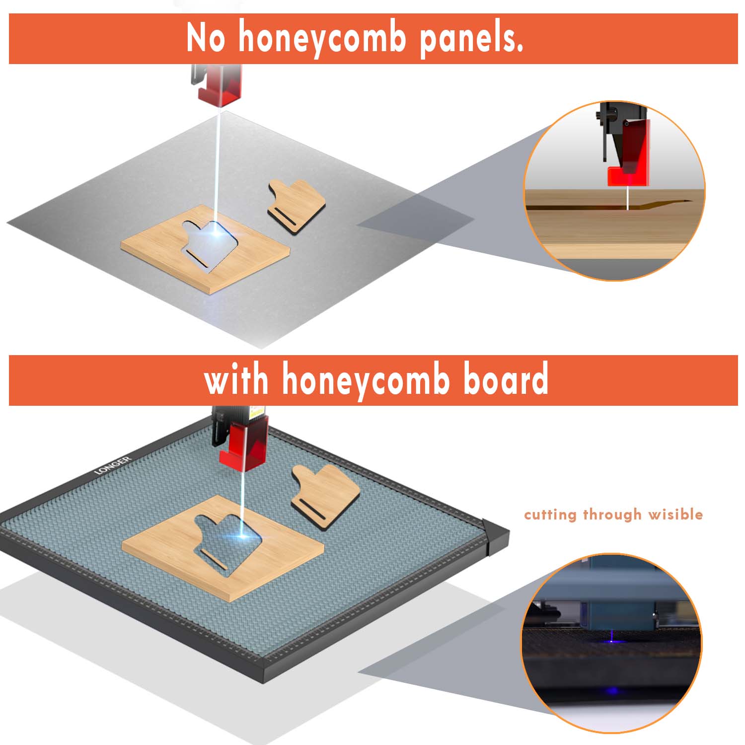 2. Optimaalinen koko ja aukko: suuri 300*200*22mm hunajakennopöytä, jossa 9mm aukko, parantaa ilmavirtausta ja savun poistoa, mikä tekee leikkuureunoista puhtaammat.