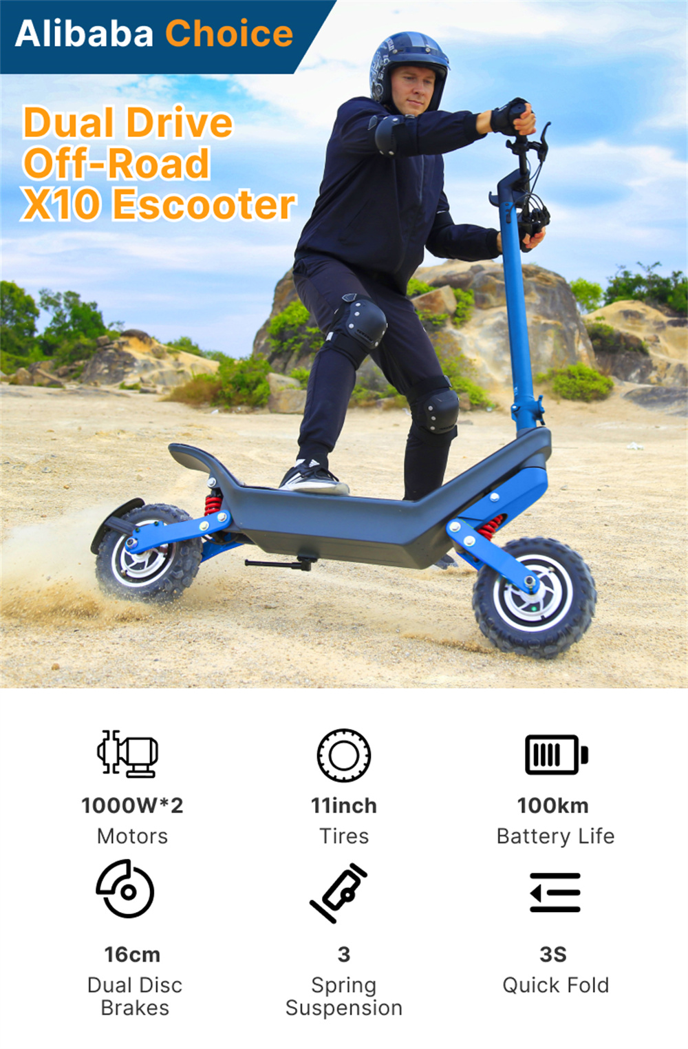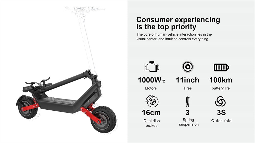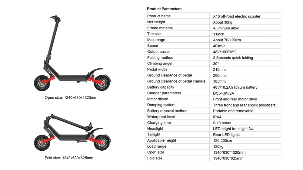 HX X10W on tehokas, taittuva sähköpotkulauta kaksinkertaisella 1000W-moottorilla, 48V18.2AH -akulla ja 11-tuumaisilla renkailla. Se tarjoaa enintään 40KM/H huippunopeuden, jopa 70–100 km toimintasäteen olosuhteista riippuen sekä IP54-roiskevesisuojauksen. LED-näyttö, ajovalo ja takavalo sekä kaksoislevyjarrut ja sähköjarru lisäävät käyttömukavuutta ja turvallisuutta.
