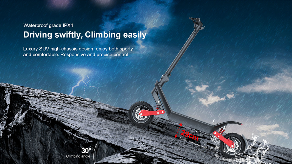 - Kaksi 1000W -moottoria vahvaan kiihtyvyyteen ja mäennousuun (nousukulma 30°)