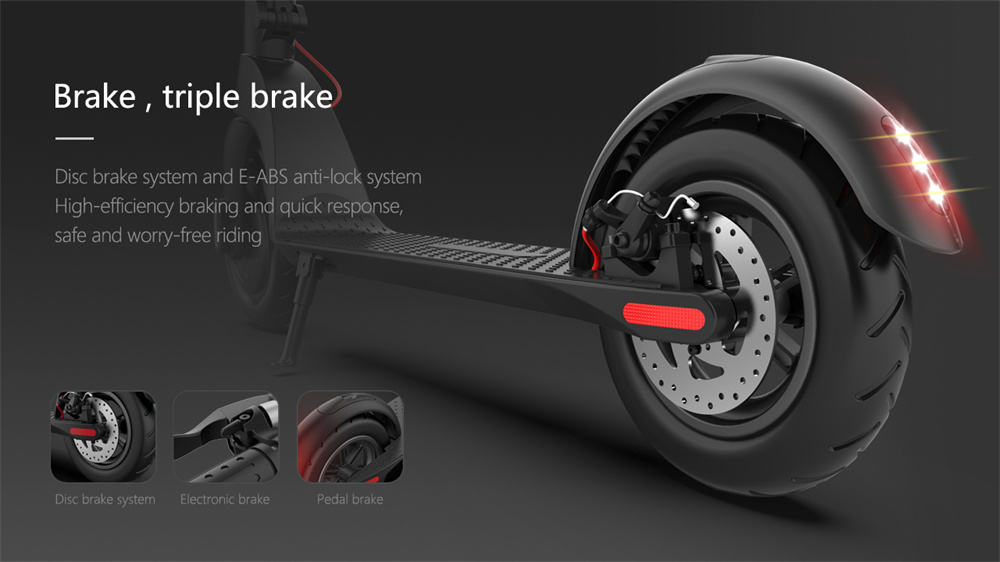 - 10-tuumaiset renkaat mukavaan ja vakaaseen ajoon- Kaksi jarrua: levyjarru + sähköjarru
