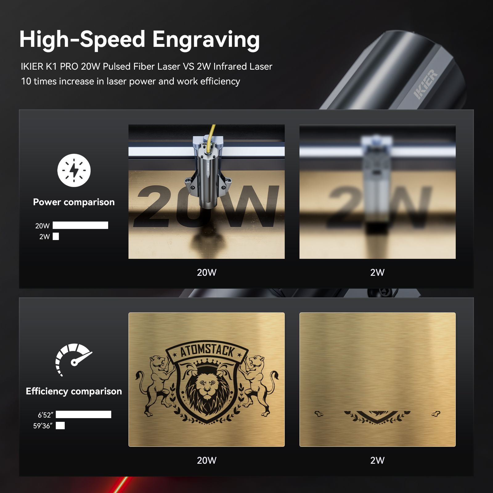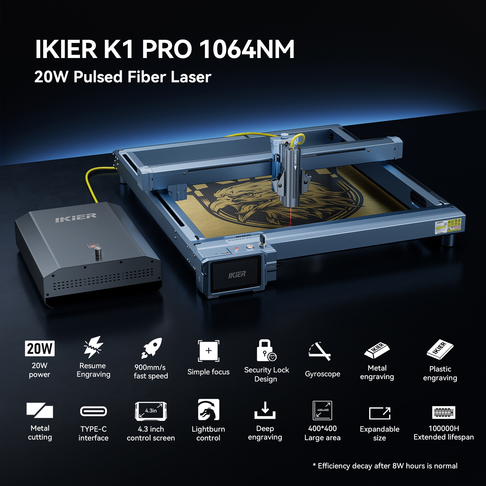 IKIER K1 Pro 1064nm on 20W kuitulaserkaiverrin ja -leikkuri metalleille, muoveille ja useille muille materiaaleille. Laite tarjoaa jopa 900mm/s työnopeuden, tarkan 0.01mm kaiverrustarkkuuden sekä offline-ohjauksen 4.3-tuumaisella kosketusnäytöllä.