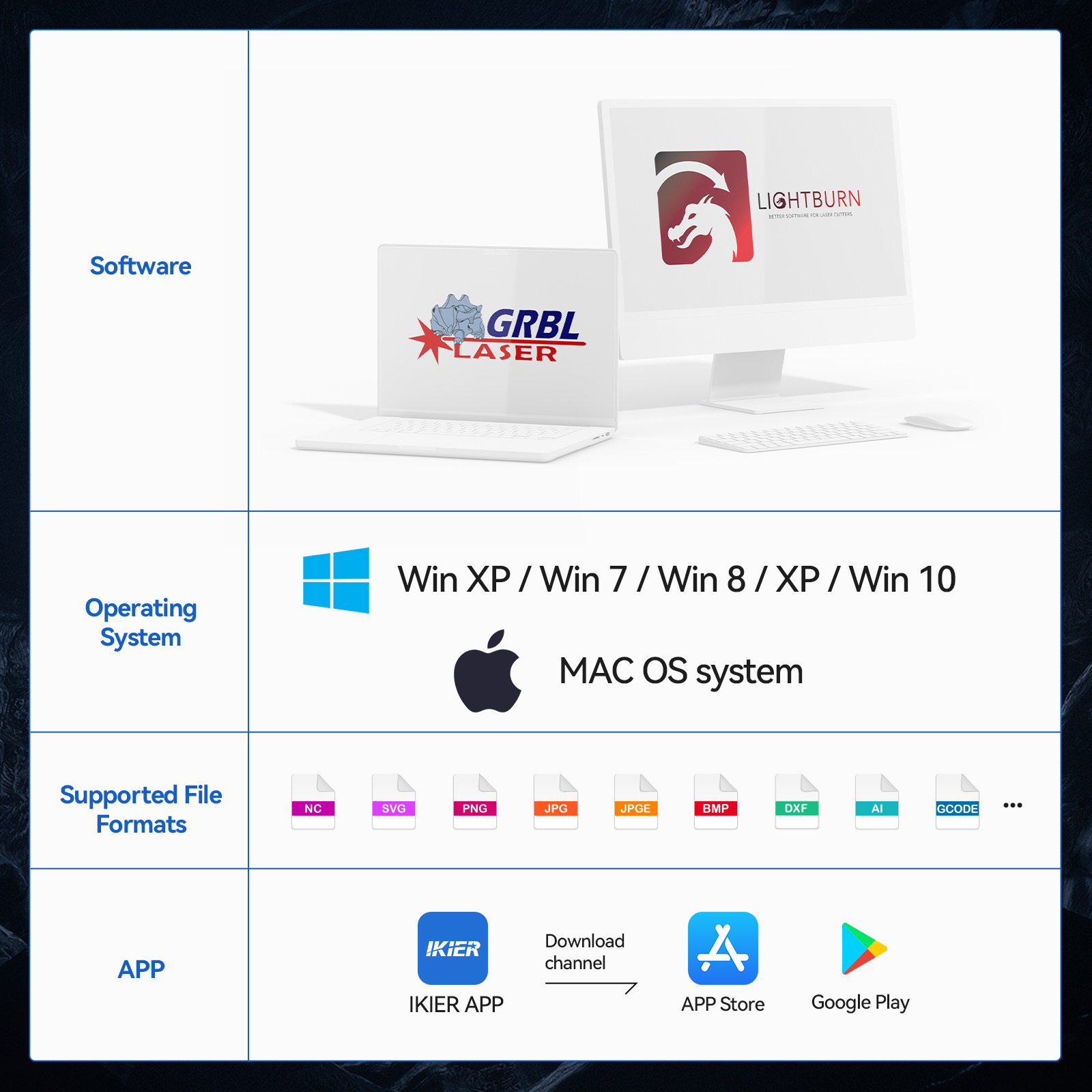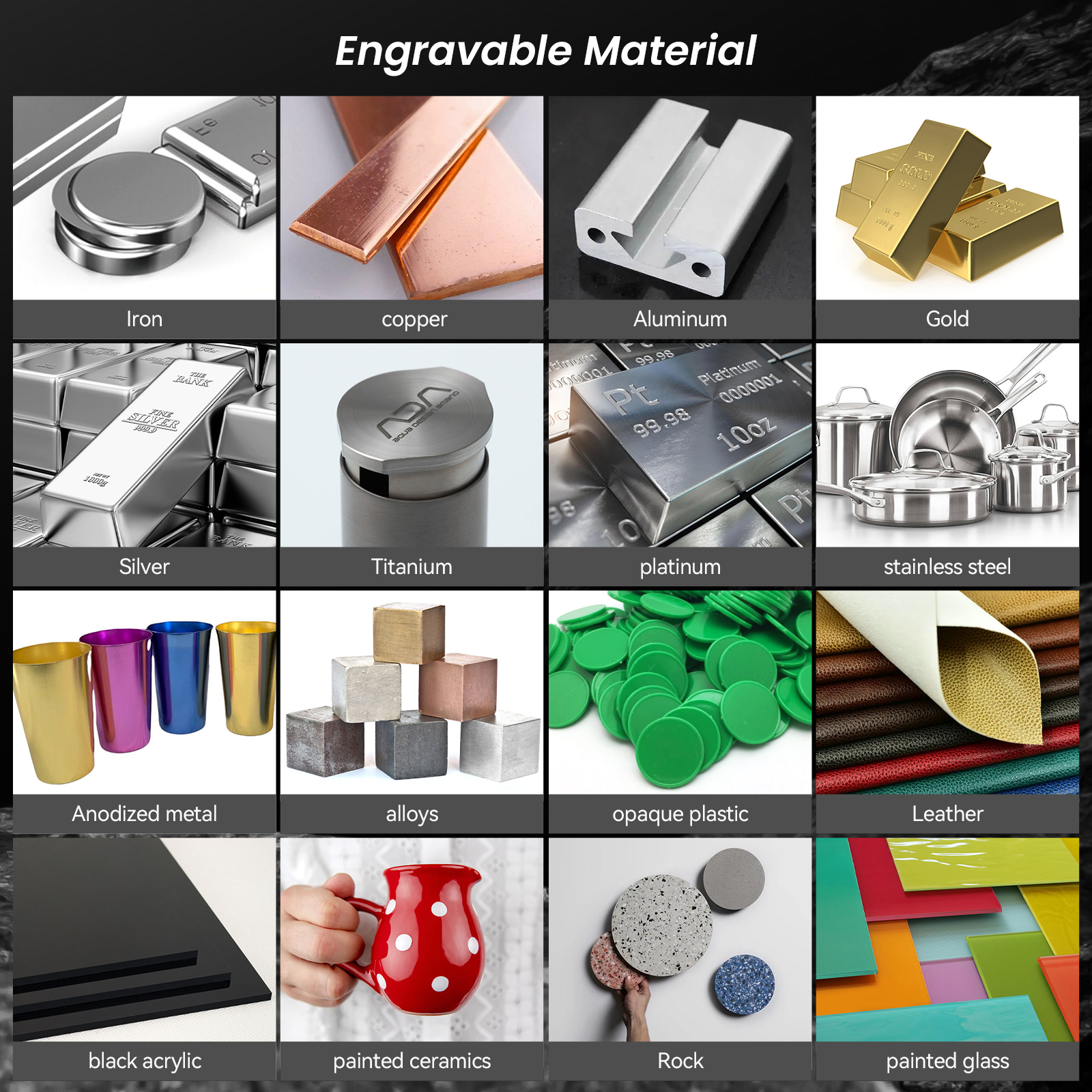 Kaiverrettavat materiaalit: piirilevy (PCB), akryyli, alumiinioksidi, pinnoitettu ja lakattu metalli, 304-peilikiillotettu ruostumaton teräs, lasi, keramiikka, puuvilla, liuskekivi, nahka