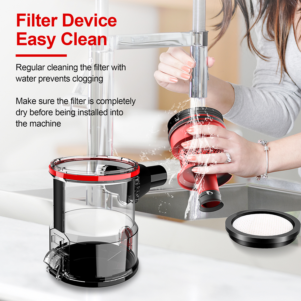 ● Helppo puhdistaa: 1L pölysäiliö tyhjenee painamalla alaosan punaista painiketta ilman, että kädet likaantuvat. Suodatin voidaan irrottaa ja pestä vedellä, sen on kuivuttava täysin ennen takaisin asennusta. Säännöllinen suodattimen puhdistus parantaa tehokkuutta.