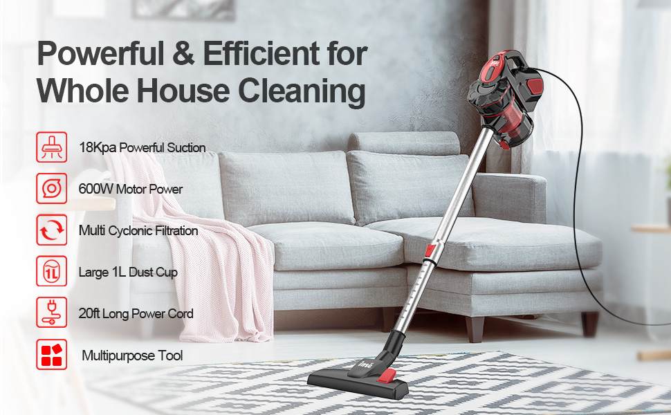 ● Vahva imu: 600W moottori tuottaa jopa 18KPA imutehon. Soveltuu esimerkiksi keittiön muruille, lemmikkien ruoanjätteille, karvoille ja pähkinämuruille. Kaksi työtilaa eri pinnoille, kuten huonekalujen ja sohvien pinnat sekä sängyn alta siivoaminen. (On normaalia, että moottori lämpenee, jos laite käy liian pitkään yhtäjaksoisesti.)