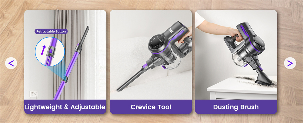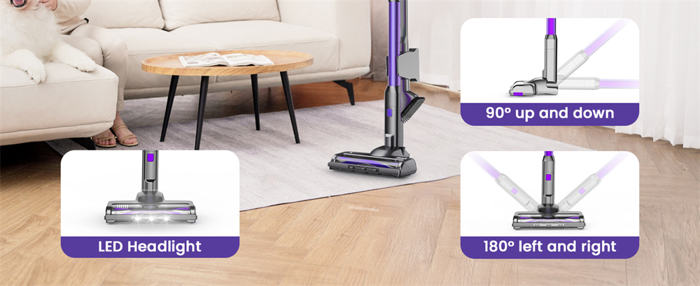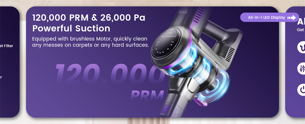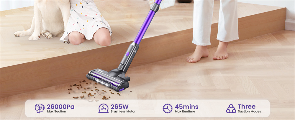 120,000 kierrosta/min -harjaton moottori tuottaa jopa 26000Pa imutehon pölyn, lemmikkikarvojen ja roskien tehokkaaseen poistoon – sopii koville lattioille, laatoille ja matalan nukan matoille.