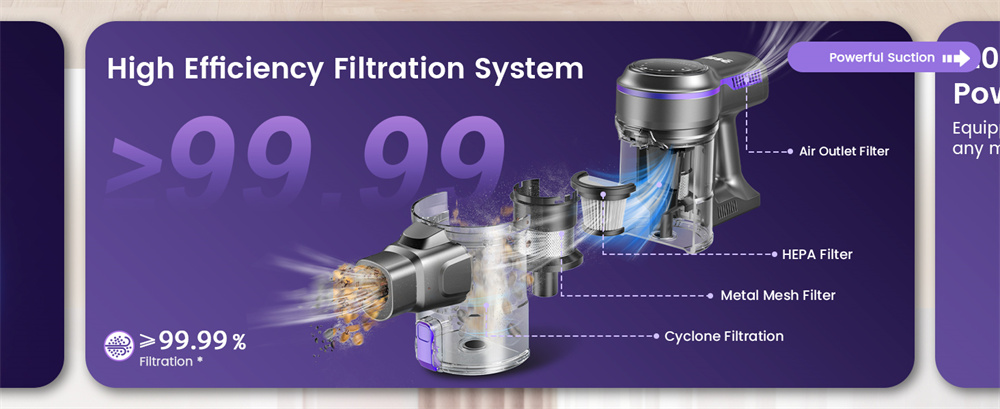 Monisyklooninen erotus ja HEPA-suodatin vangitsevat jopa 99.99% hienojakoisesta pölystä ja allergeeneista, edistäen parempaa sisäilman laatua.