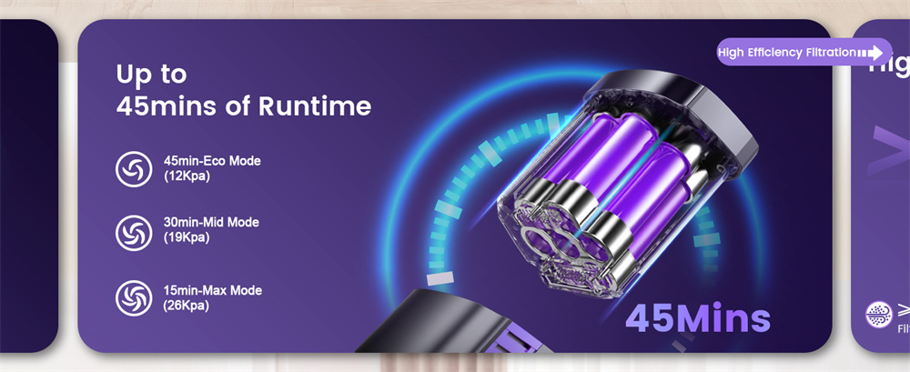 Vaihda helposti tilojen välillä: Eco (12 kPa / 45 min), Keski (19 kPa / 30 min) ja Max (26 kPa / 15 min) eri siivoustarpeisiin arjen pikapuhdistuksista perusteelliseen siivoukseen.
