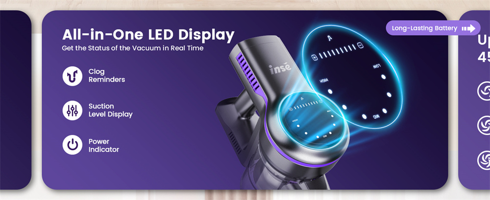 INSE S7 Pro johdoton varsi-imuri 26000Pa imuteho 265W jopa 45 minuutin käyttöaika lemmikkikarvoille