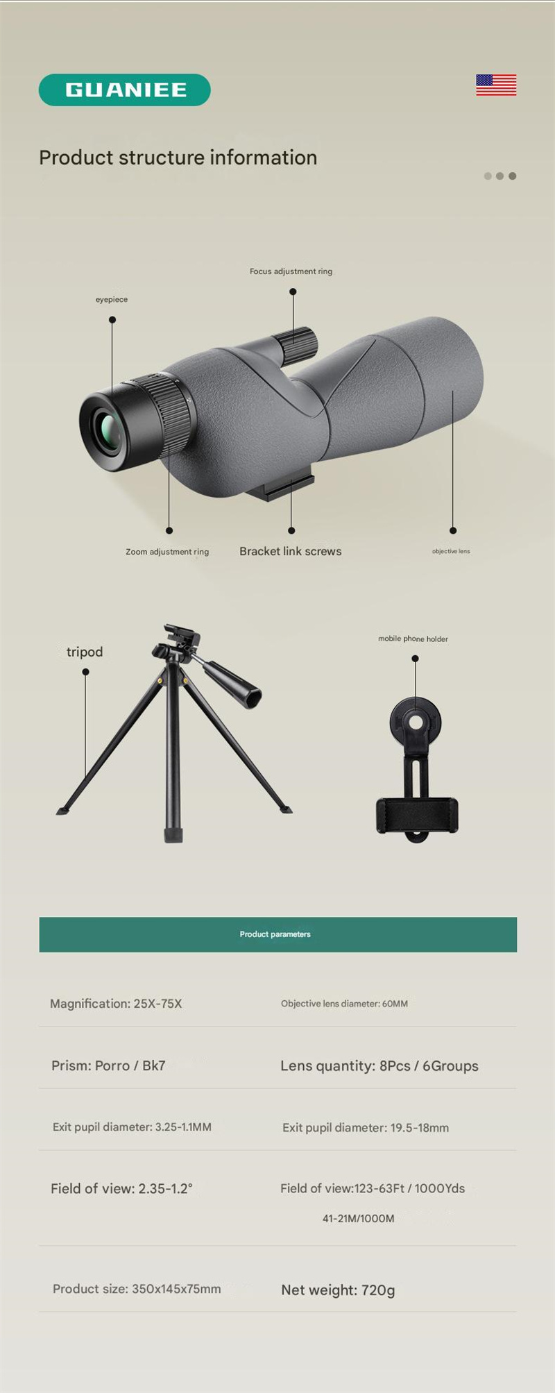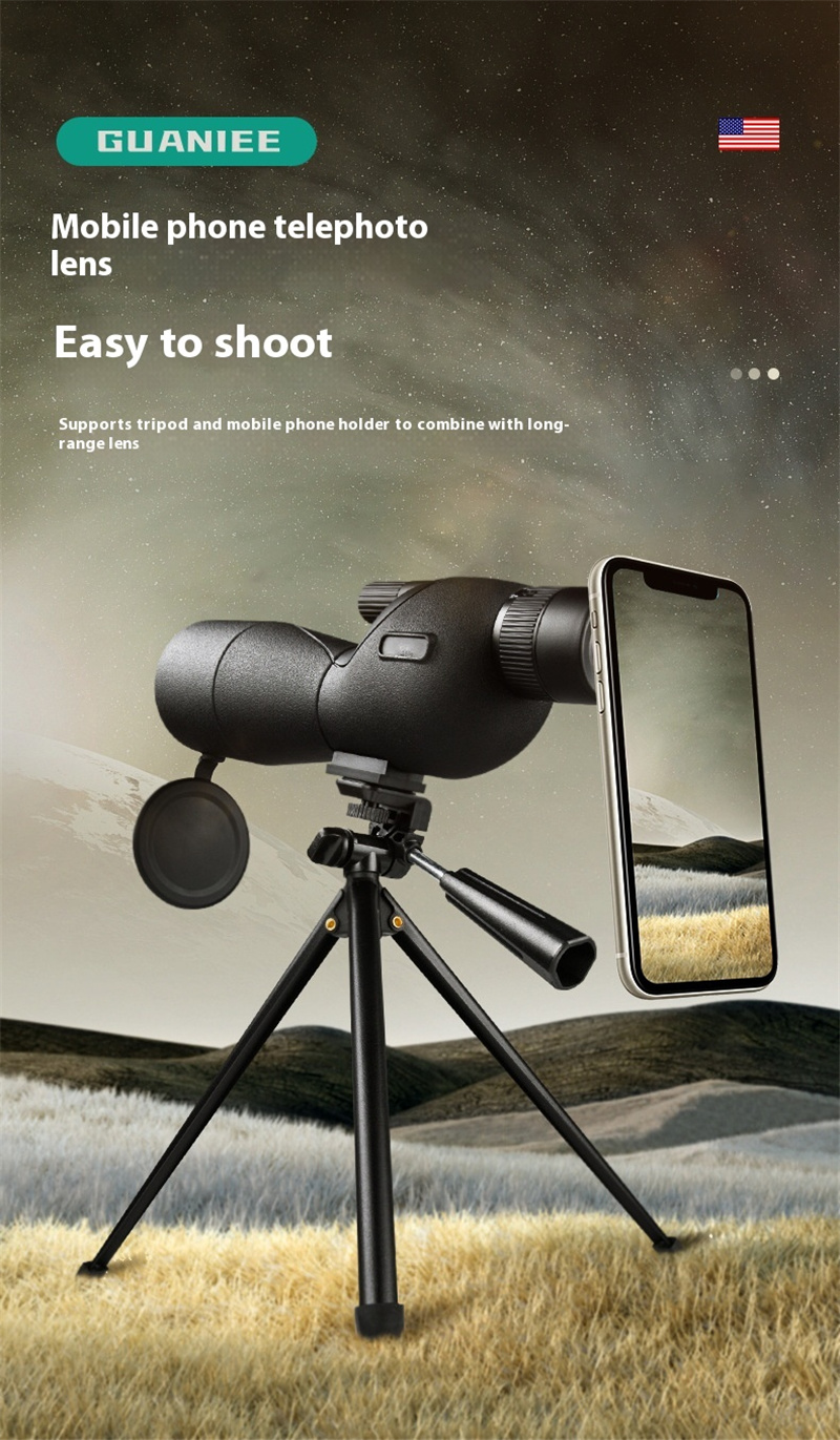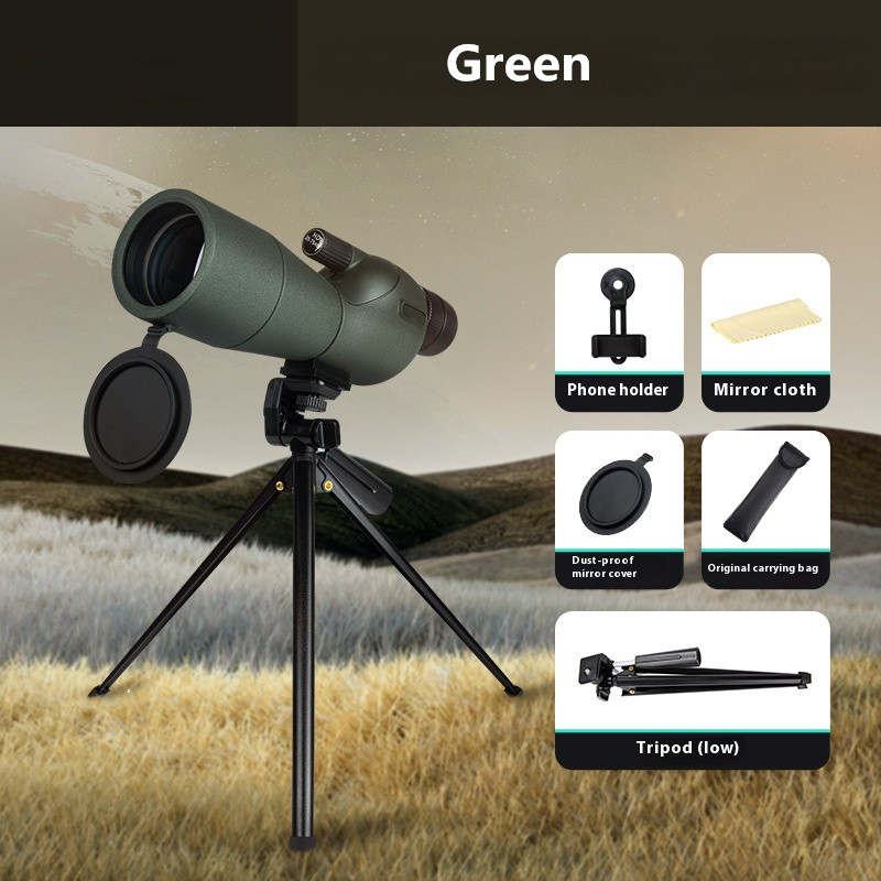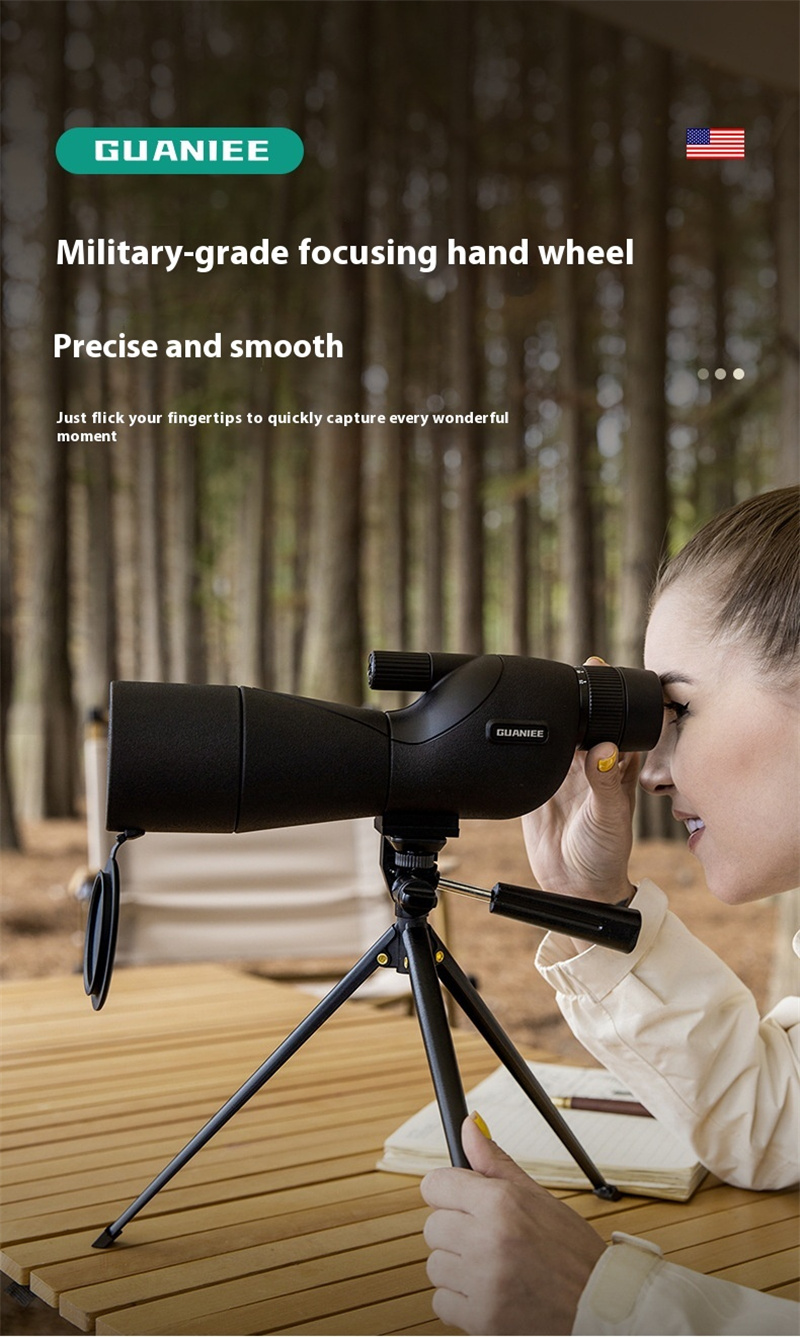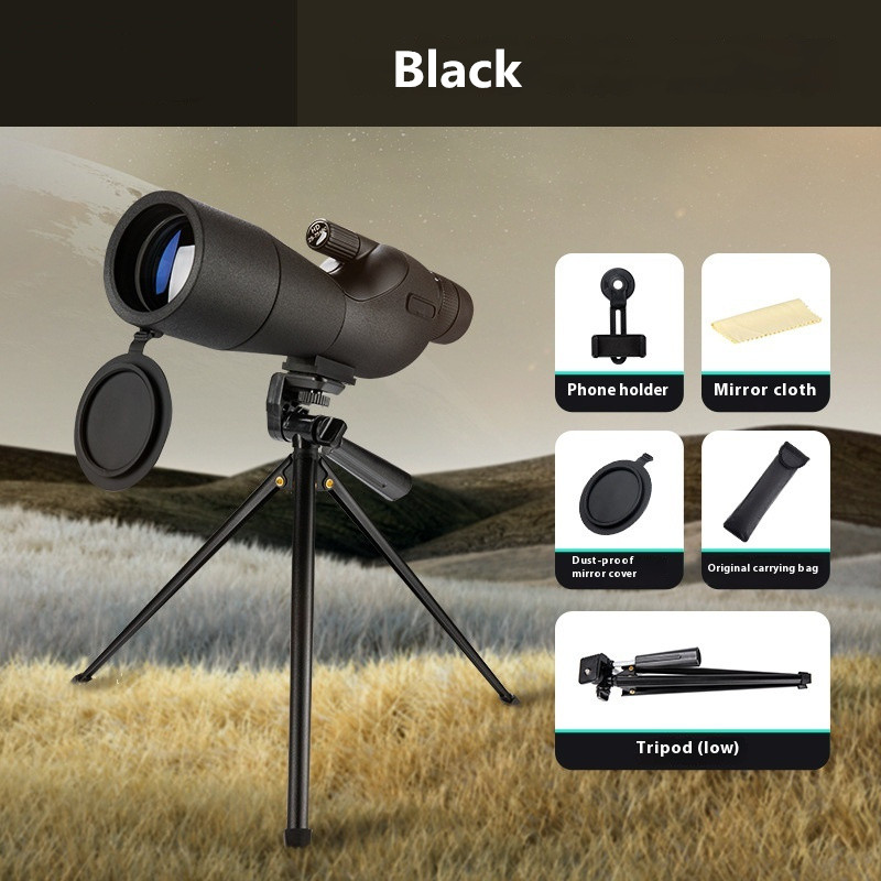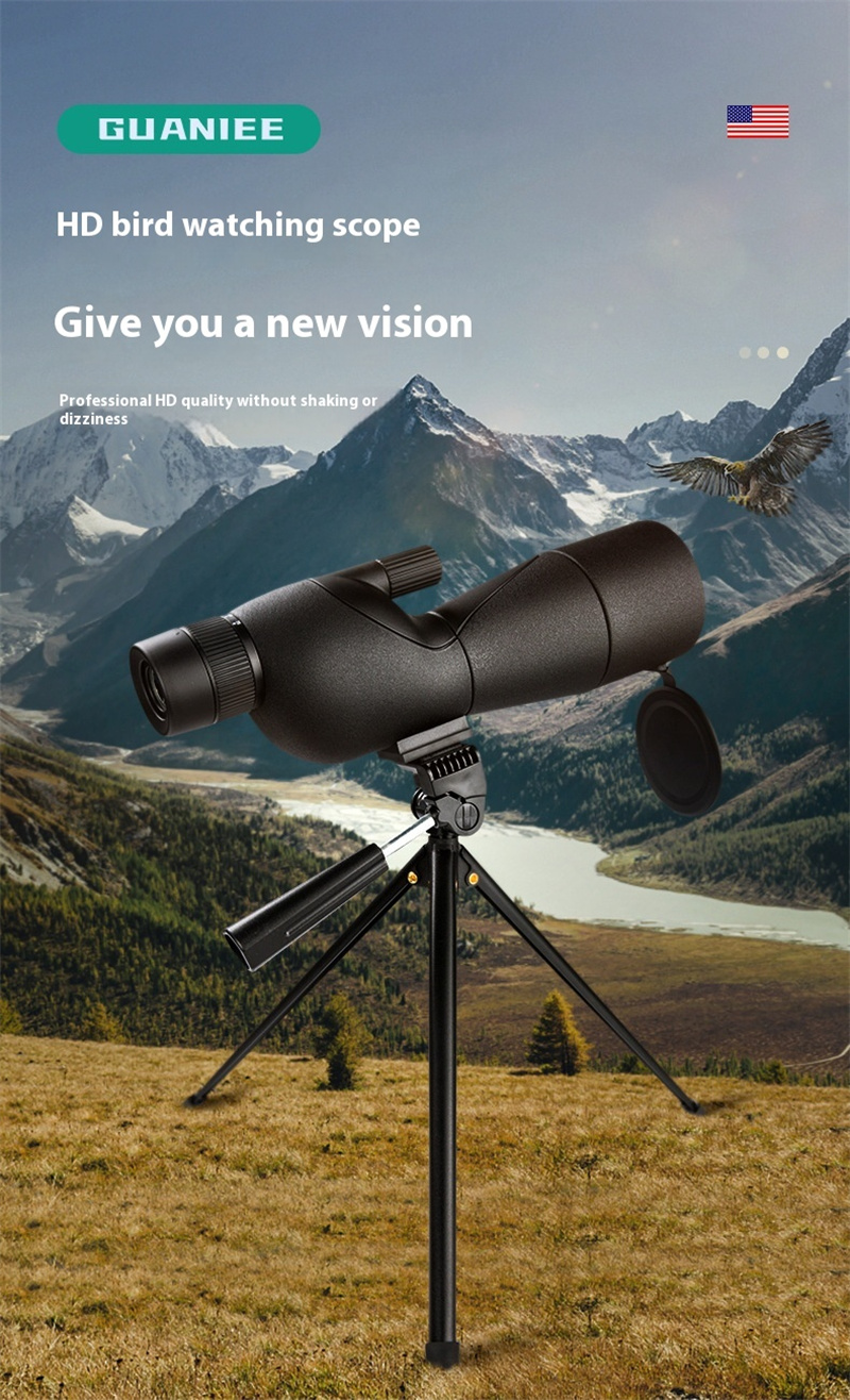 Monikäyttöinen kaukoputki 25–75X zoomilla ja 60 mm objektiivilla tarjoaa selkeän kuvan luontoharrastuksiin, lintujen tarkkailuun, retkeilyyn ja tapahtumien seurantaan. BAK7-prisma ja roiskevedenkestävä rakenne tukevat käyttöä vaihtelevissa olosuhteissa. Mukana tulevat jalusta ja puhelinpidike helpottavat vakaata havainnointia ja kuvien ottamista.