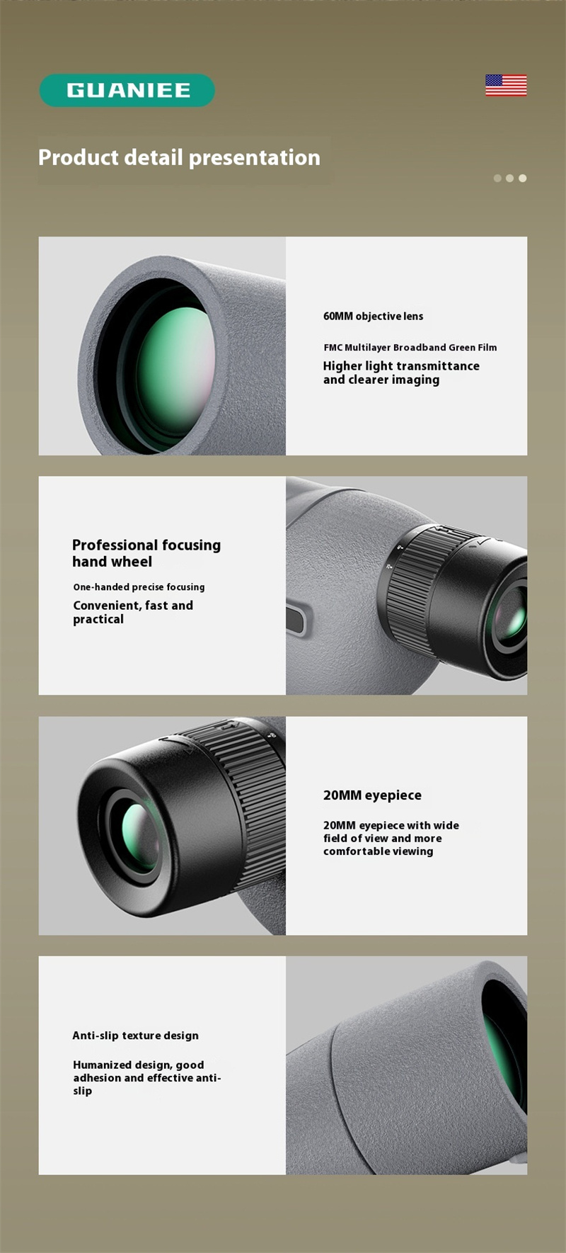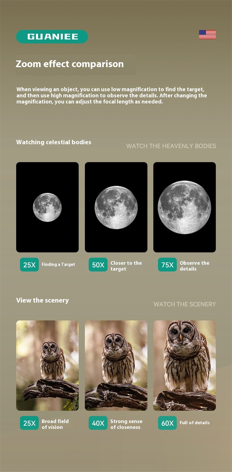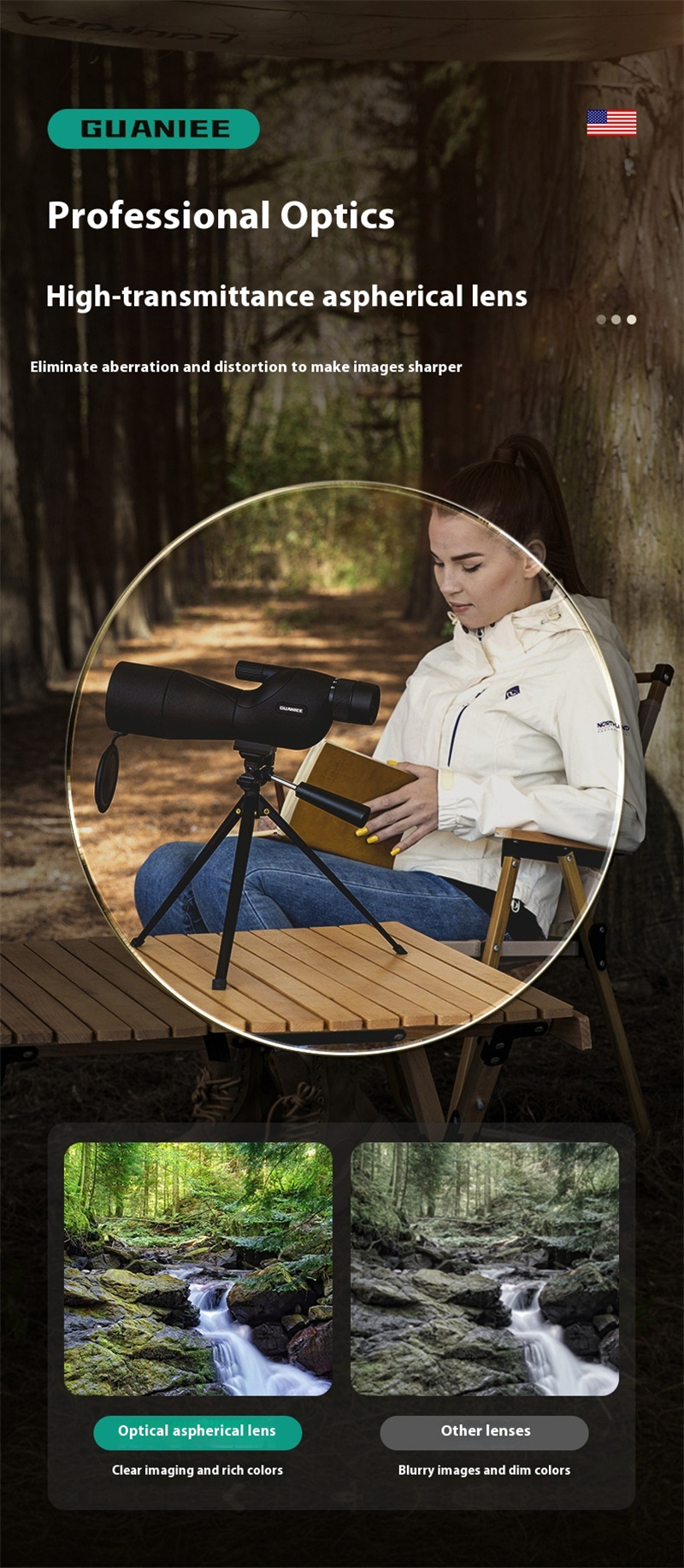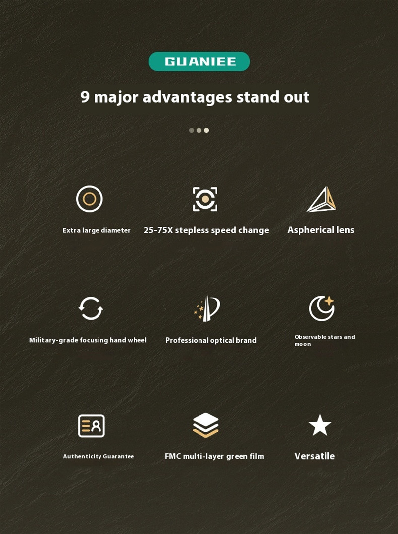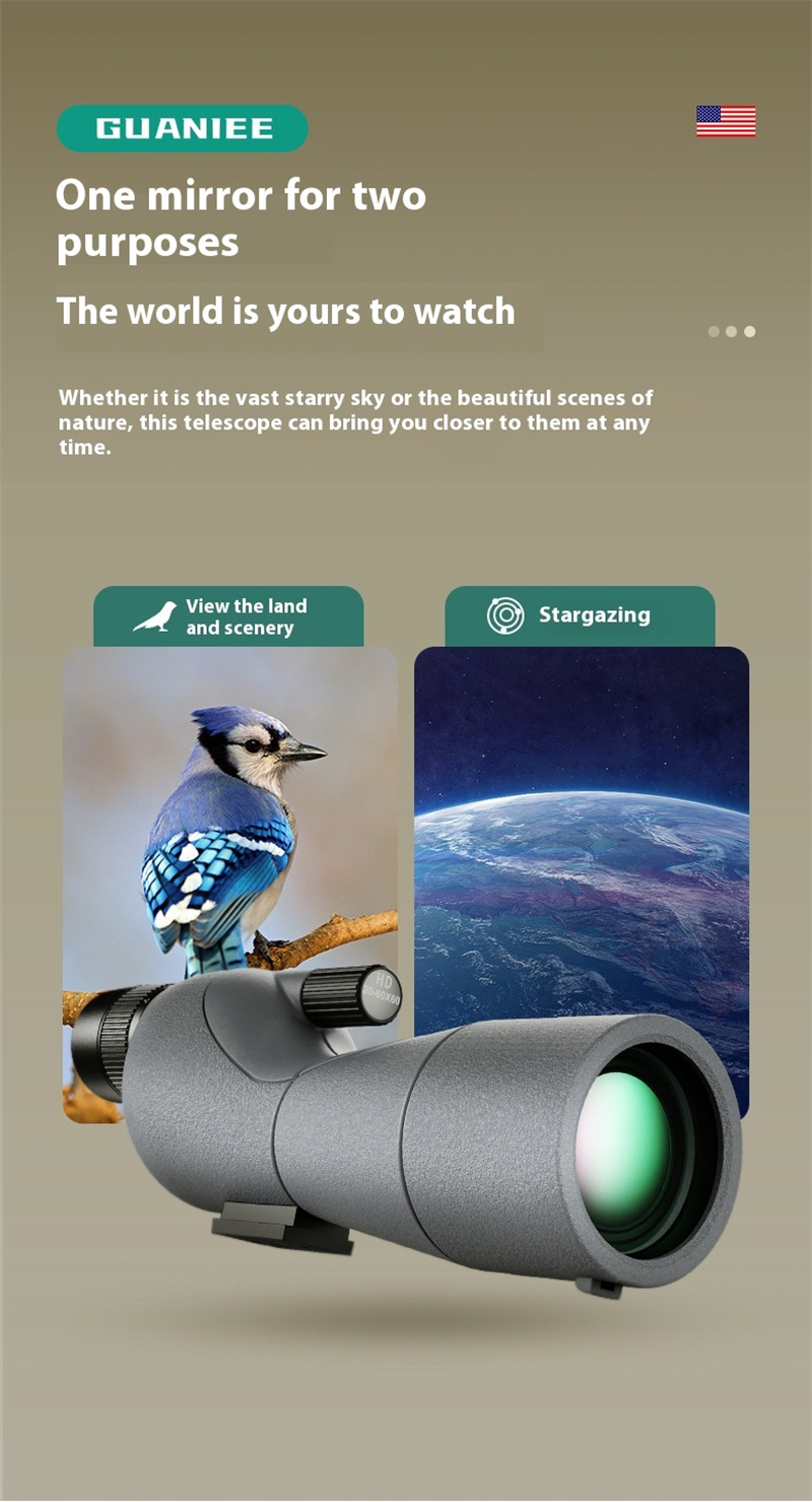 Monikäyttöinen kaukoputki 25–75X zoomilla ja 60 mm objektiivilla tarjoaa selkeän kuvan luontoharrastuksiin, lintujen tarkkailuun, retkeilyyn ja tapahtumien seurantaan. BAK7-prisma ja roiskevedenkestävä rakenne tukevat käyttöä vaihtelevissa olosuhteissa. Mukana tulevat jalusta ja puhelinpidike helpottavat vakaata havainnointia ja kuvien ottamista.