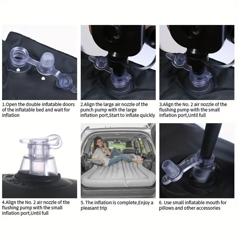 1. SUV-ilmapatja, leirintämatto ja tyynyt – paksu, täytettävä autossa käytettävä ilmapatja sähköpumpulla, flockattu pinta, helposti mukana kulkeva makuualusta matkailuun ja leirintään.
