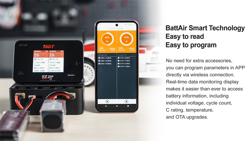 ISDT BattAir 2. sukupolven 7.4V 900mAh 30C 2S älykäs LiPo-akku sovellusohjauksella JST-liittimellä