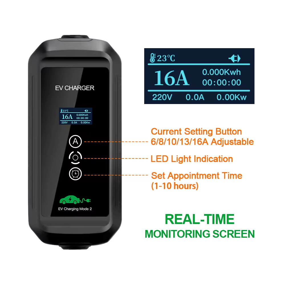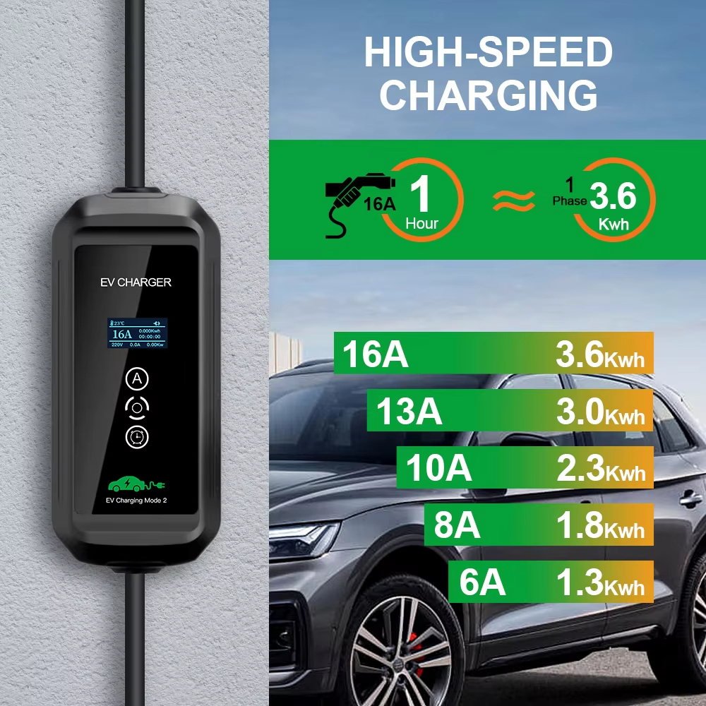 • Säädettävä virta: valitse 6A/8A/10A/13A/16A tarpeen mukaan ja yhteensopivaksi eri pistorasioiden ja ajoneuvojen kanssa.