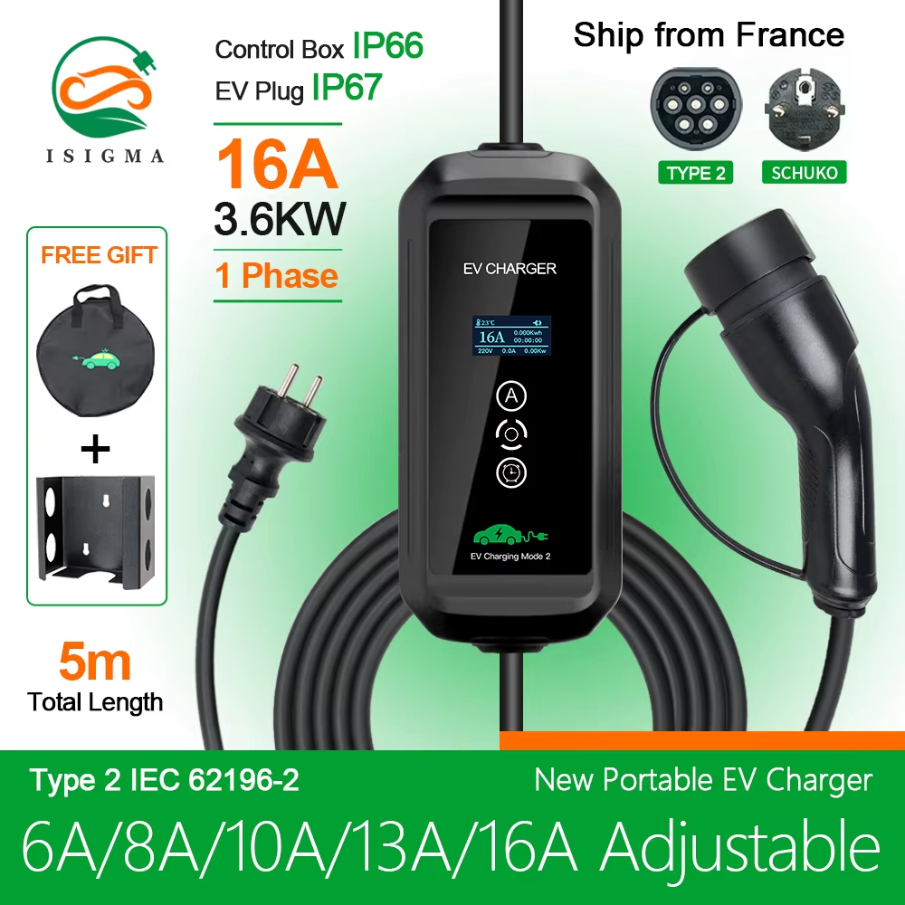 ISIGMA 3,6 kW 16A kannettava laturi sähköautolle tyyppi 2 5 m kaapelilla IP66/67