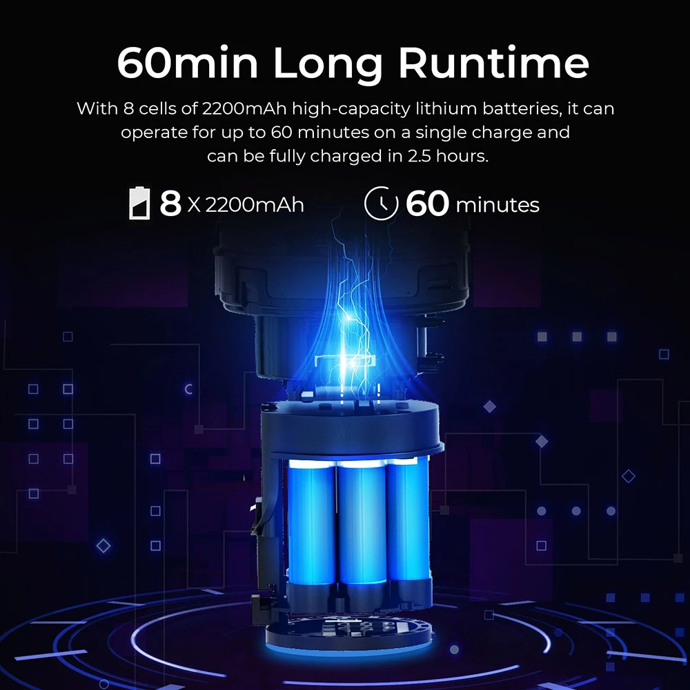 2200mAh 8‑kennon akku tarjoaa jopa 60 minuuttia siivousaikaa. Irrotettava akku mahdollistaa joustavan latauksen ja tarvittaessa pidemmän käyttöajan vara-akulla.