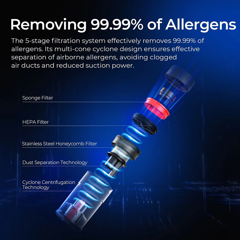 500W moottori ja 33KPa imuteho poistavat lian nopeasti. 5‑vaiheinen suodatus vangitsee jopa 99.99 % allergeeneista ja hienopölystä.