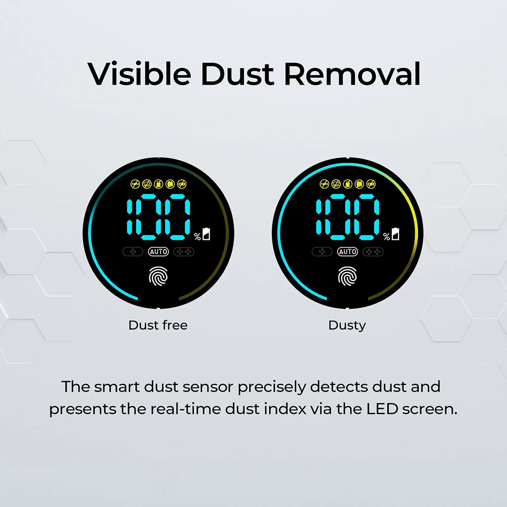 Reaaliaikainen pölyindeksi, akun tila, virheilmoitukset ja tilanvaihto näkyvät selkeästi kosketus‑LED‑näytöllä.