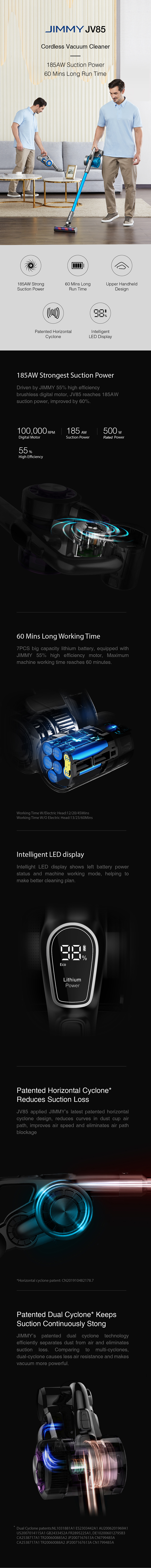 Tuotemerkki: JIMMY Malli: JV85 Tuotenimi: johdoton pölynimuri Jännite: 25.2V Nimellisteho: 500W Imupaine: 23Kpa Ilmavirta: 1.2 m³/min Imuteho: 185AW Moottori: harjaton digitaalinen moottori Käyttöaika sähköisellä lattiasuulakkeella: 12/20/45 min Käyttöaika ilman sähköistä lattiasuulaketta: 13/23/60 min Latausaika: 4–5 h Melutaso: 82dBA Pölysäiliön tilavuus: 0.6L |