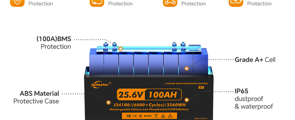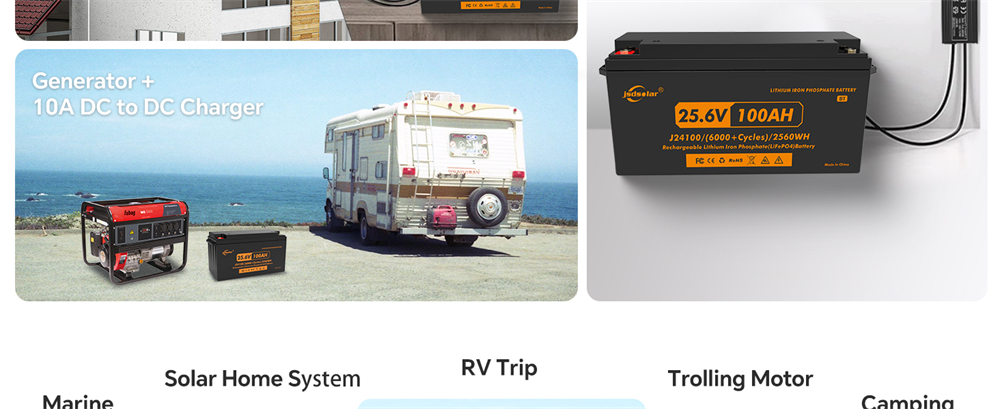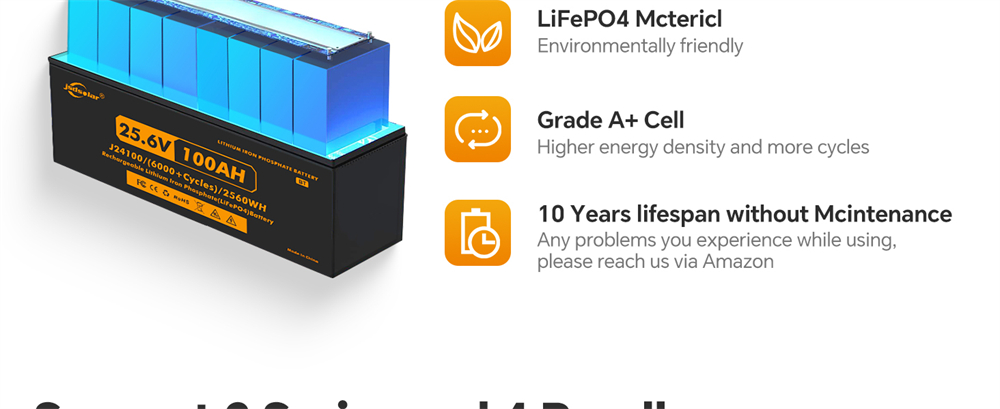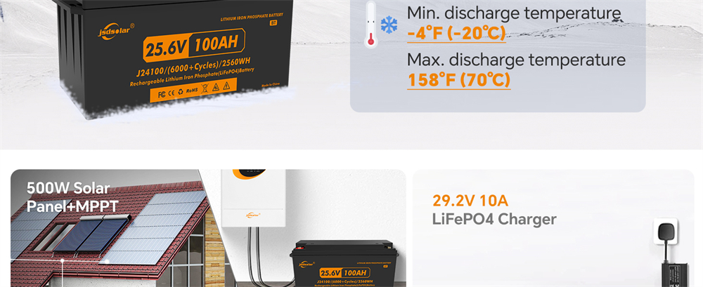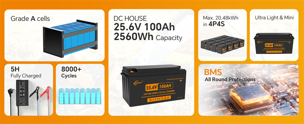 JSDSOLAR 24 voltin 100 Ah LiFePO4-akkupaketti Bluetoothilla yli 8000 sykliä veneeseen ja asuntoautoon