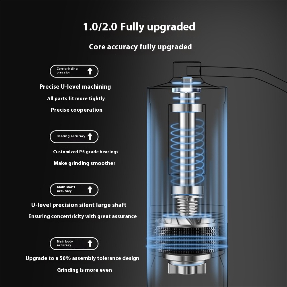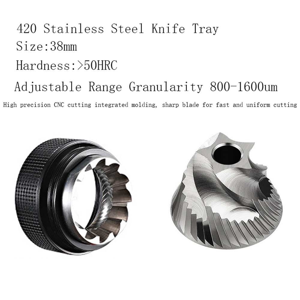 - Vankat ruostumattomasta teräksestä valmistetut kartiojauhinterät: 38mm 420-teräs (HRC ≥ 50) pitkään käyttöikään ja tarkkaan jauhatukseen.- 36-tasoinen säätö: säädä 800–1600 mikroniin, sopii espressoon, valutussuodatukseen, pressopannuun, AeroPressiin ja muille menetelmille.