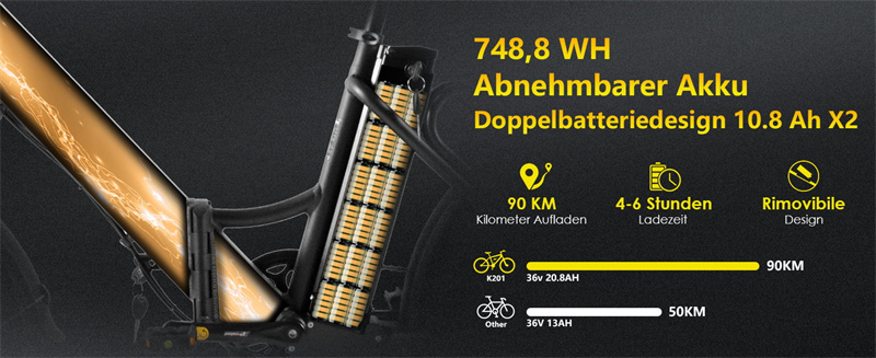 - Kaksi 36V 10.4*2 akkua (748.8Wh) pidempää toimintasädettä varten