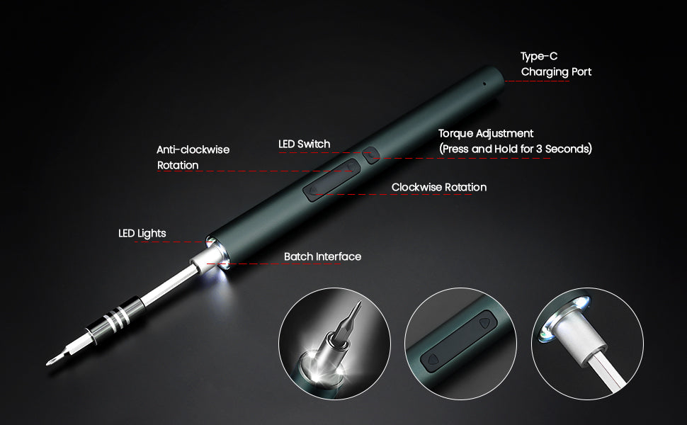 Sähköruuvimeisseli tarjoaa enintään 200 rpm (tyhjäkäyntinopeus) ja säädettävän vääntömomentin 0.15-0.35Nm eri tarpeisiin. Yhdistettynä eteen- ja taaksepäin -suuntapainikkeisiin ruuvien kiristäminen ja löysääminen käy nopeasti ja vaivattomasti.