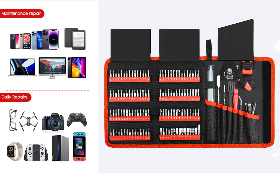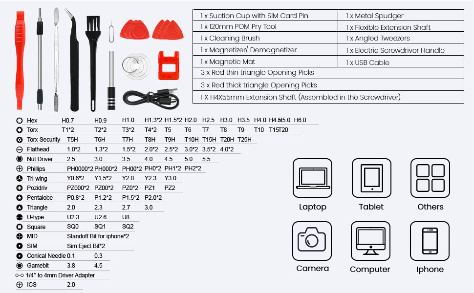 Sähköinen ruuvimeisselisarja 137 osaa on monipuolinen tarkkuustyökalu sähkö- ja elektroniikkalaitteiden huoltoon. Sarja sisältää yhteensä 137 osaa: 120 tarkkuusbitsiä CRV-hopeanikkeliteräksestä, imukupin SIM-kortin avaustapilla, metallisen avausläpykän, 120 mm POM-avauksen, joustavan jatkovarren, puhdistusharjan, kulmapinsetit, magneetin/magneetinpoistajan, sähköisen ruuvimeisselikahvan, magneettialustan, USB-datakaapelin, 3 punaista ohutta kolmionmuotoista avauspalaa, 3 punaista paksua kolmionmuotoista avauspalaa sekä H4X55mm jatkovarren (valmiiksi asennettuna ruuvimeisseliin).