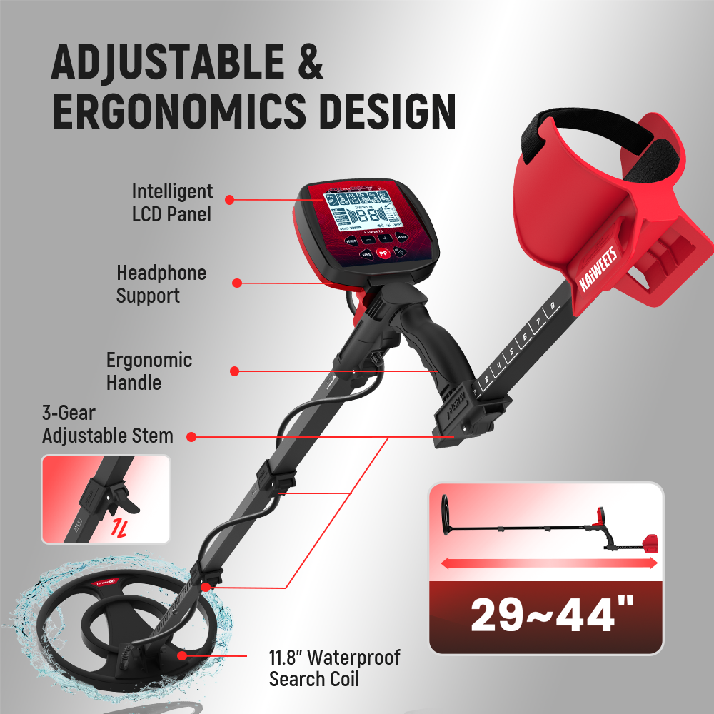 Säädettävä ja ergonominen rakenne: Metallinpaljastimessa on 5-portainen herkkyyden säätö ja 29–44 tuuman pituudelle säädettävä varsi, joten se sopii käyttäjille kaikenikäisille. Käsitukeen perustuva rakenne tekee käytöstä mukavaa, ja taitettava muoto helpottaa kuljettamista ja säilytystä.