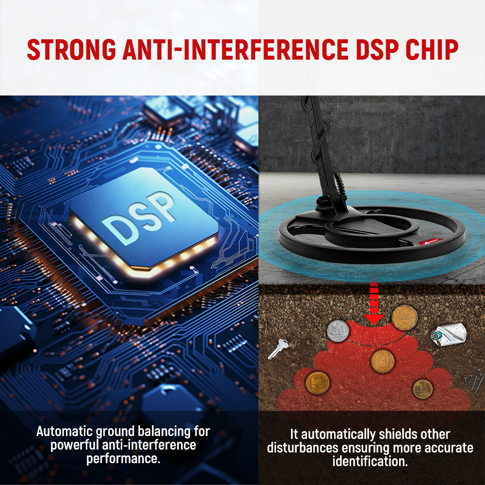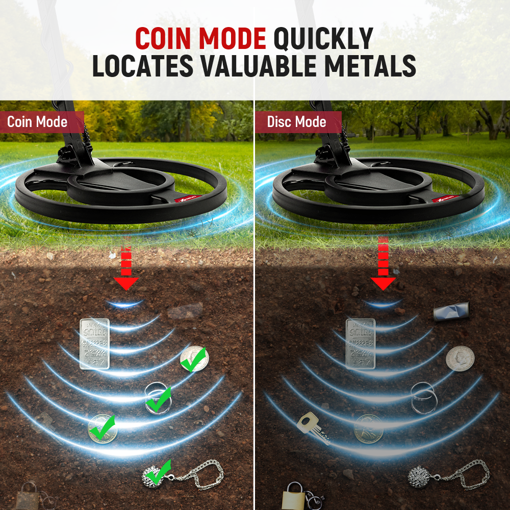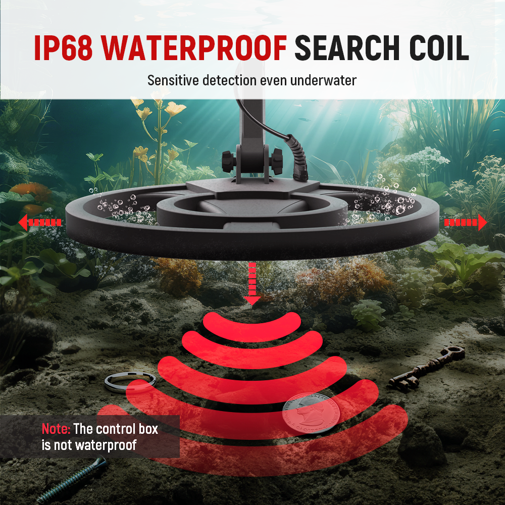 Tarkka tunnistus: Kehittyneen maatasapainotusjärjestelmän ansiosta laite paikantaa kohteet tarkasti ja vähentää maaperän mineralisaation vaikutusta. IP68-suojattu 10-tuumainen etsinkela mahdollistaa tunnistuksen jopa 11.8 syvyyteen.