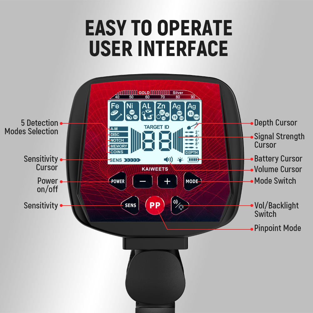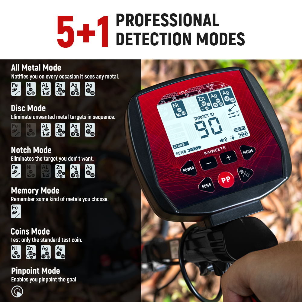 Monipuoliset tunnistustilat: KAIWEETS EXPLORER X Ⅰ -metallinpaljastimessa on kuusi edistynyttä tunnistustilaa – kaikki metallit, diskriminointi, poistovalinta (notch), muisti, kolikot ja paikannus. Näiden avulla metallin etsintä on kohdennettua ja tehokasta.