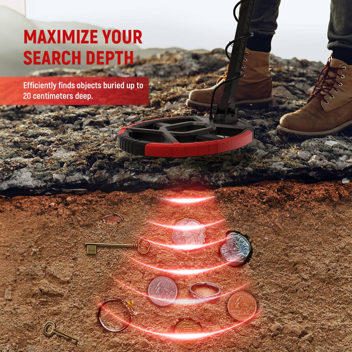 4. Korkea herkkyys: Päivitetty DSP-siru parantaa metallinilmaisimen herkkyyttä, jolloin se pystyy havaitsemaan sekä kolikon kokoiset että suuremmat metalliesineet. Maatasapainotuslaite vähentää mineraalipitoisen maan vaikutuksia ja parantaa mittaustulosten tarkkuutta.