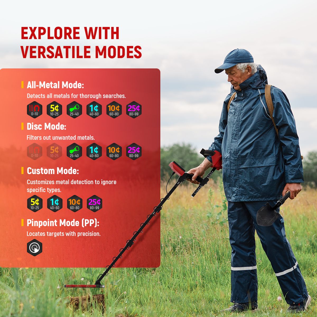 2. Monipuoliset etsintätilat: Valitse neljästä tilasta: kaikille metalleille sopiva tila, poistotila ei-toivottujen kohteiden suodattamiseen, valintapoistotila yksilölliseen kohteiden poistoon sekä paikannustila tarkan sijainnin löytämiseen.