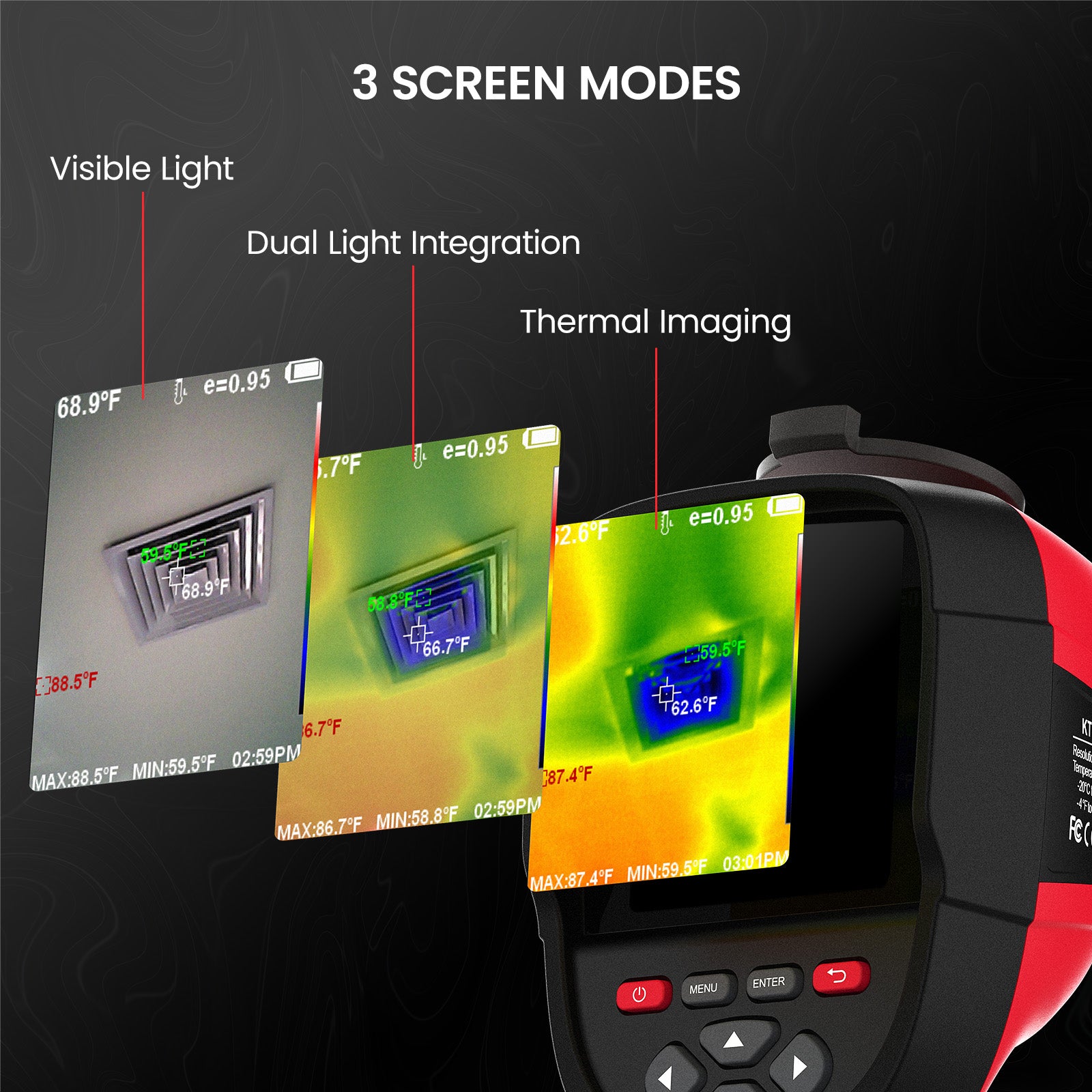 Mallissa KTI-W01 on kolme kuvantamistilaa: infrapuna, näkyvä valo ja fuusio. Näin voit valita sopivimman tilan erilaisiin käyttökohteisiin. Lisäksi käytettävissä on useita väripaletteja, joiden avulla voit valita työhösi parhaiten sopivan väriasteikon.