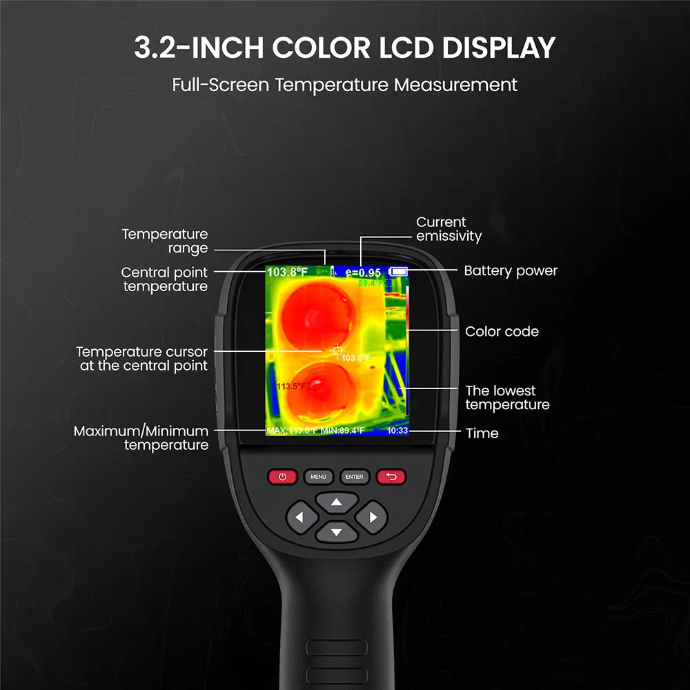 Laite tukee videon tallennusta, ja 3.2-tuumainen värinäyttö tarjoaa selkeän näkymän kohteista ja lämpötilaeroista, mikä parantaa havainnoinnin tarkkuutta.