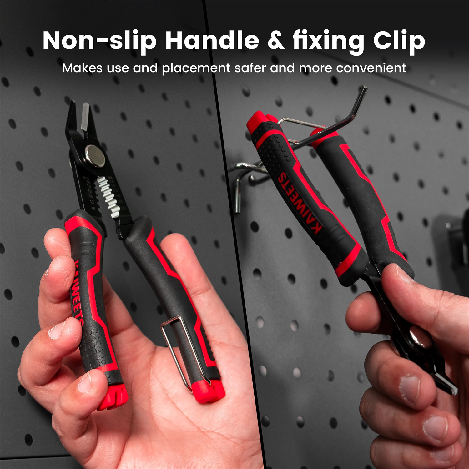 1. Monitoimityökalu: Tehokas työkalu, joka soveltuu kuparin, alumiinin, vaippakaapeleiden, johtimien, kaapeleiden ja eristettyjen liittimien katkaisuun sekä tarkkaan 10-20 AWG -johtimien kuorintaan.