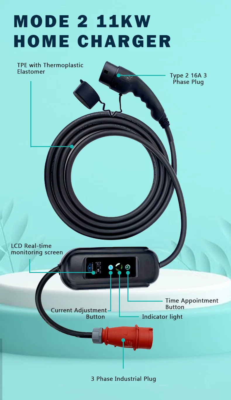 Kannettava kymmenen metrin kuudentoista ampeerin kolmivaiheinen yhdentoista kilowatin sähköauton pikalaturi kotiin