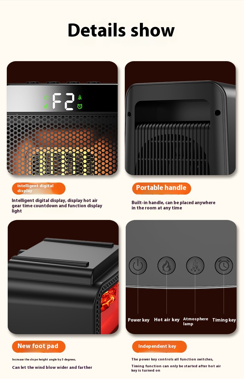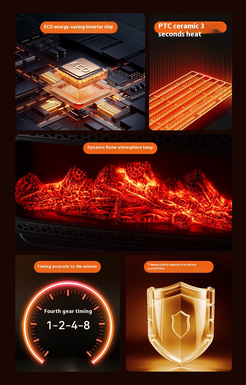 Kompakti henkilökohtainen lämmitin luo takkatulen kaltaisen tunnelman simuloidulla liekkiefektillä. 1500 W teho lämmittää nopeasti pieniä ja keskikokoisia tiloja. Kaksi lämmitystasoa, kaksi tunnelmavalon tilaa sekä 1–2–4–8 tunnin ajastin helpottavat käyttöä. Ylikuumenemis- ja kaatumissuoja lisäävät turvallisuutta.