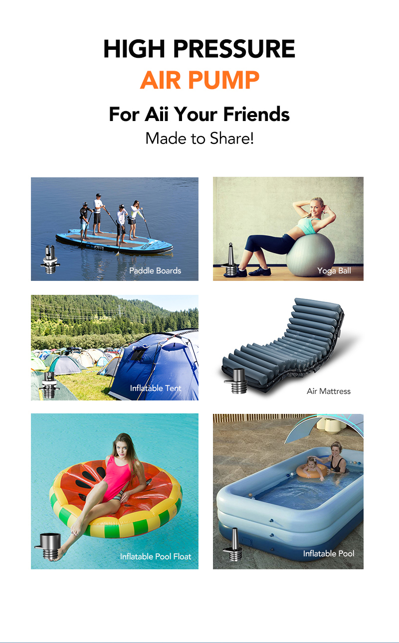 4. Monikäyttöisyys: sopii täyttämään ja tyhjentämään esimerkiksi sup-lautoja, telttoja ja muuta puhallettavaa varustusta.