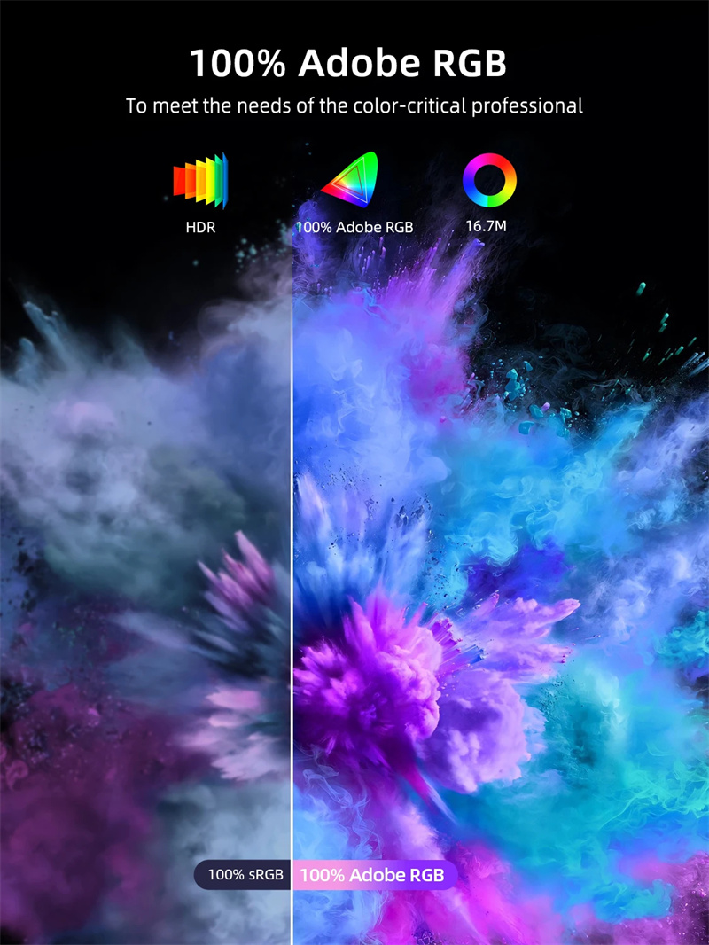 1. Kuva: 4K UHD -tarkkuus ja 100% sRGB sopivat tarkkuutta vaativaan käyttöön.2. Laajat katselukulmat: IPS-paneeli 178° katselukulmilla.