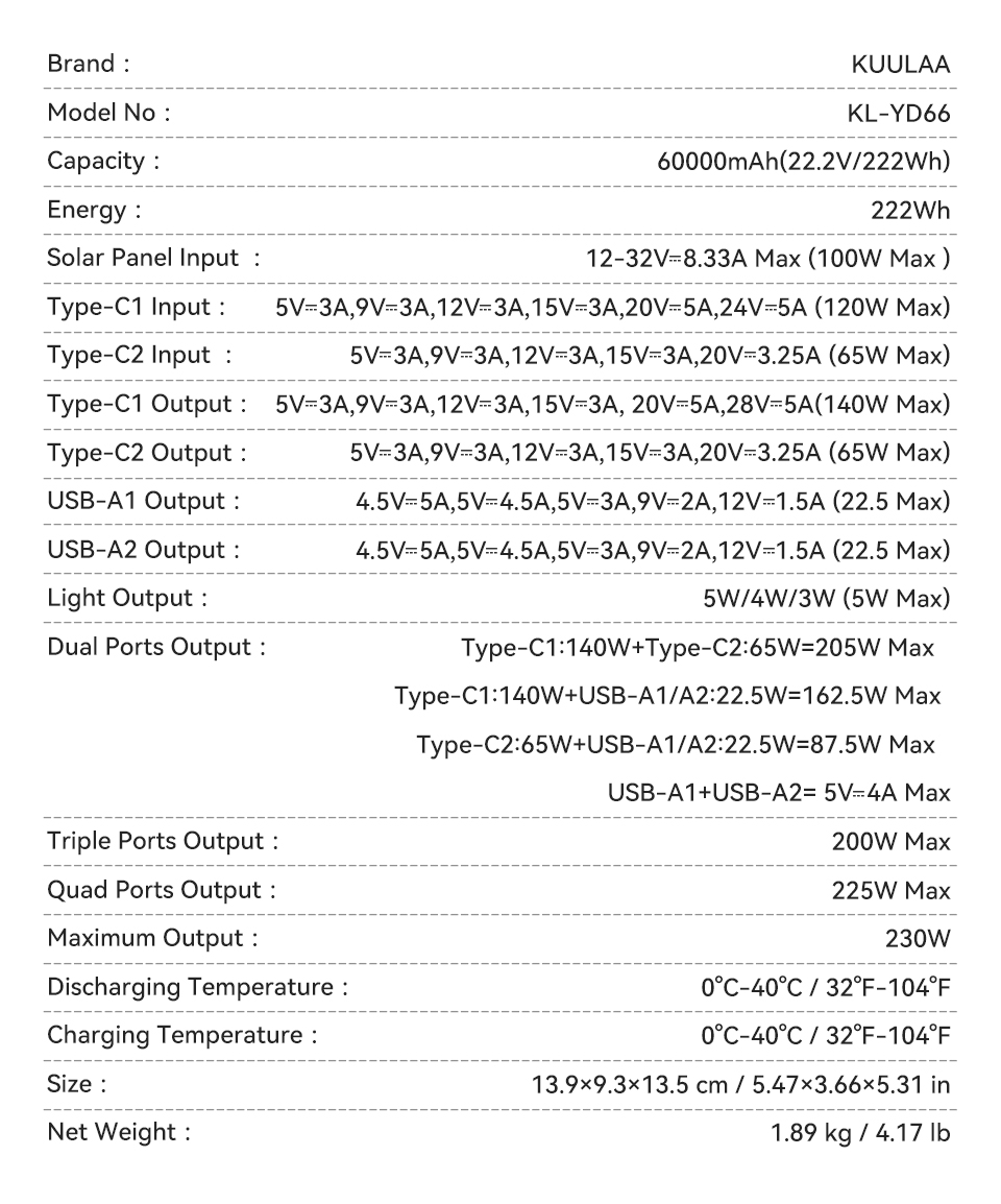 KUULAA 60000mAh 230W varavirtalähde säädettävä led-valo monipuoliset portit nopea lataus