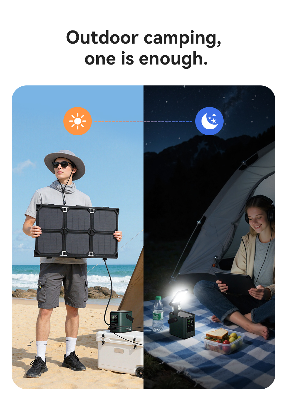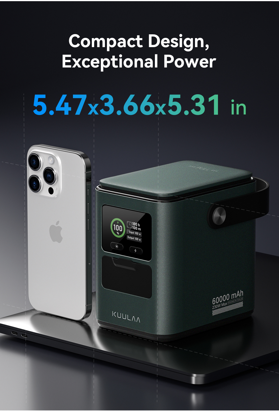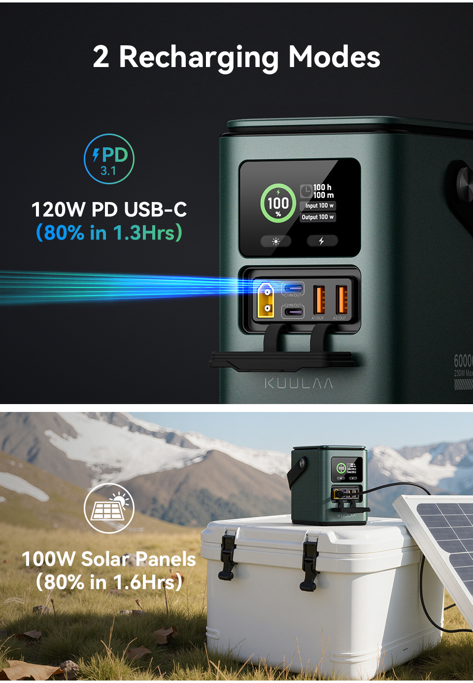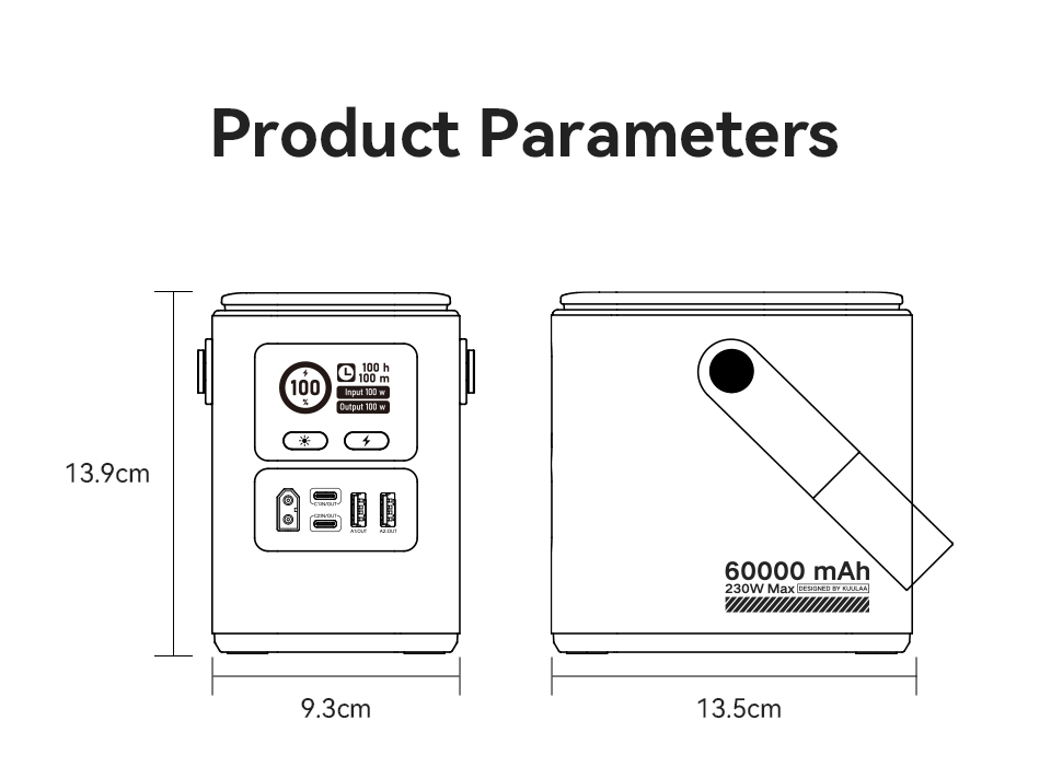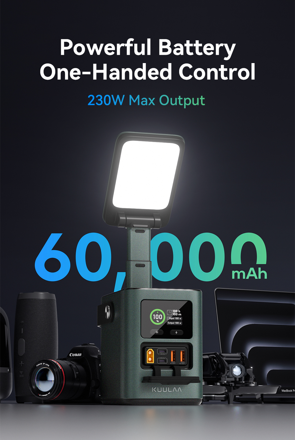 2. Suuri kapasiteetti: 60000mAh ja 230W enimmäisulostulo kattavat ulkoilun ja hätätilanteiden energiatarpeet.