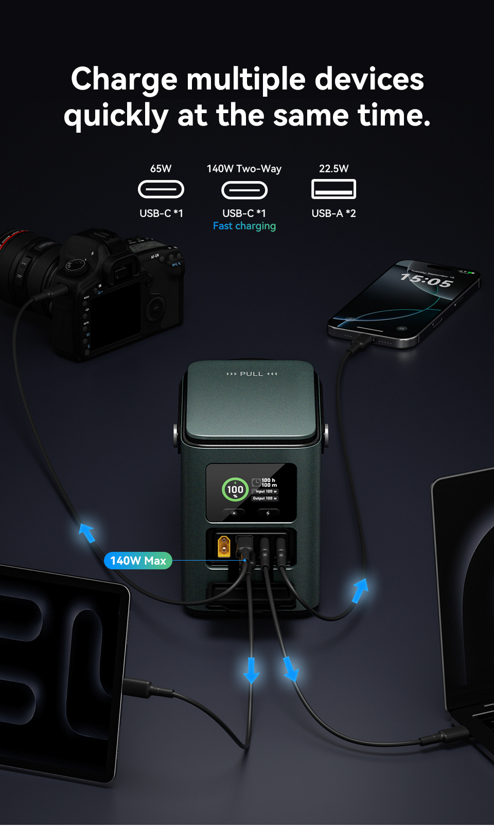 1. Useita latausportteja: 65W USB‑C, 140W kaksisuuntainen USB‑C ja kaksi 22.5W USB‑A‑porttia laitteiden samanaikaiseen lataukseen.