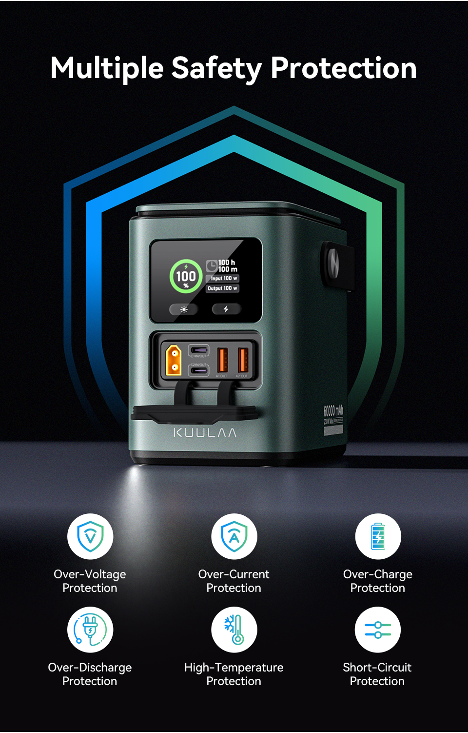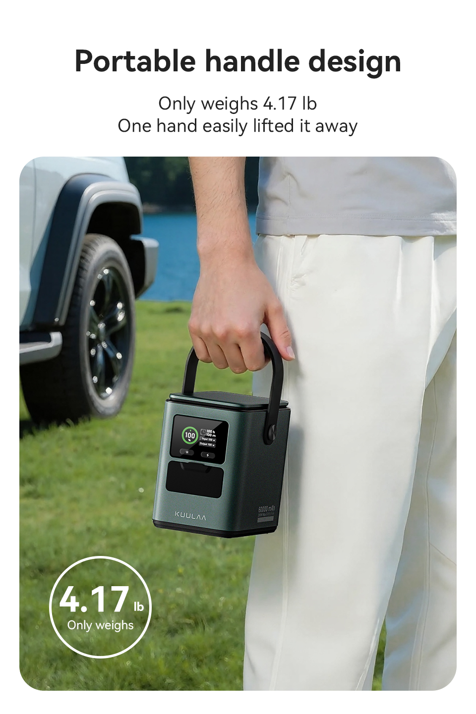 Kompakti mutta tehokas KUULAA KL-YD66 -varavirtalaite tarjoaa suuren kapasiteetin ja useita pikalatausportteja kannettaville, tableteille, puhelimille ja muille laitteille. Se sopii ulkoiluun, matkoille ja varavirtaksi sähkökatkojen varalle. Säädettävä valaisin ja helppo kantokahva lisäävät käytännöllisyyttä.